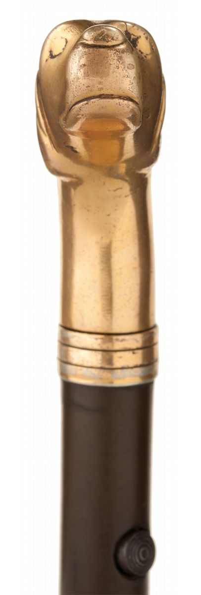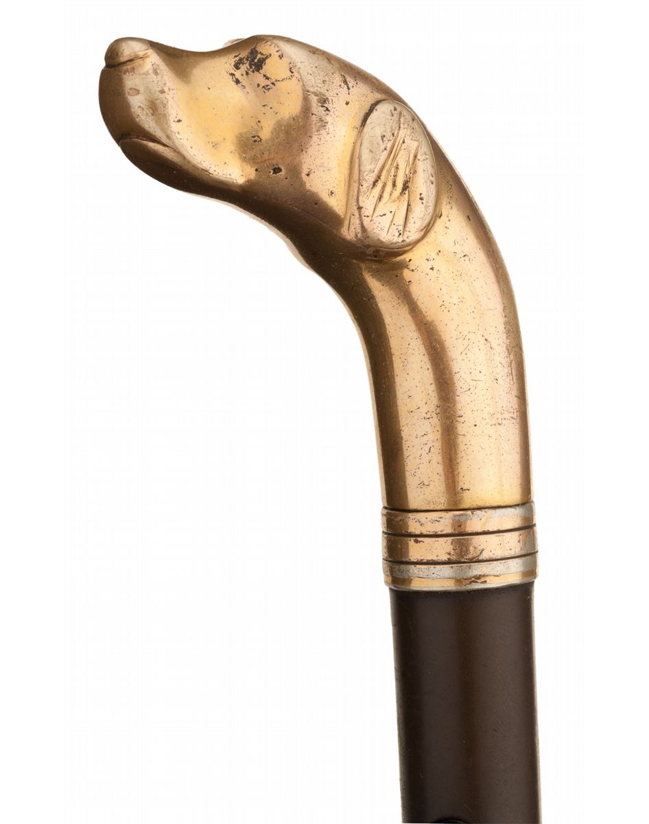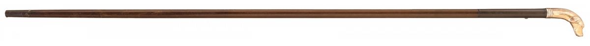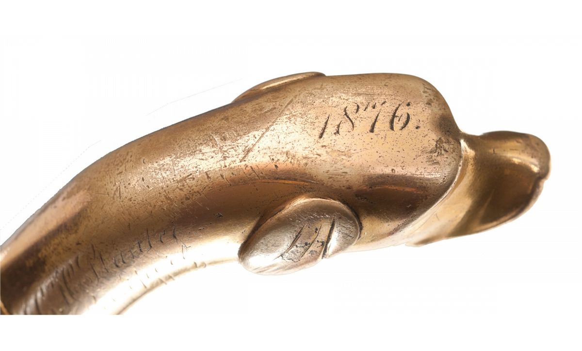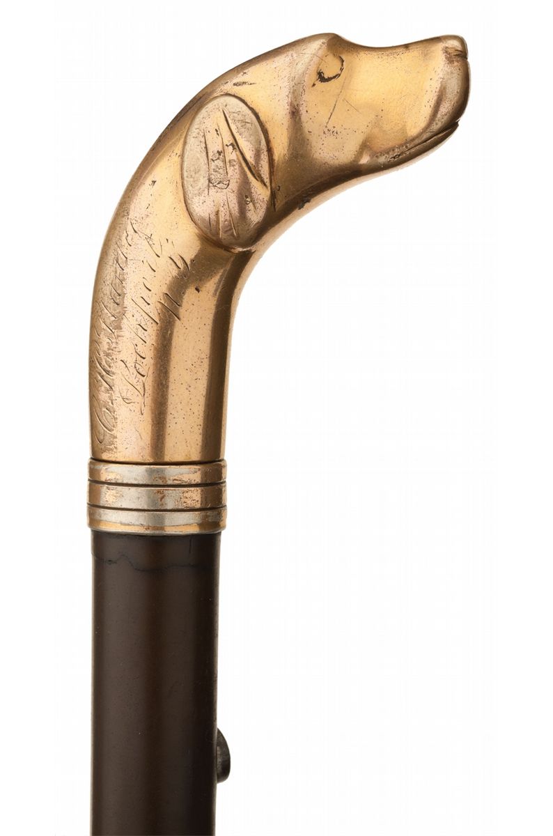 One of less than 2,000 produced between 1866 and 1888. Steel tip, with a silver finished brass post sight and a concentric circle marked firing stud emerging through the Gutta Percha veneer that covers the barrel and action, and a rear sight that pops up when the action is cocked. The dog's head is rendered in gilt finished brass, with the inscription "C.H. Stanley/Lockport/N.Y." along the right side of the neck and "1876" on top of the head. Lockport is both a city and a town in Niagra County, New York, on the route of the Erie Canal, and 1876 was the year of the American Centennial. Research indicates "C.H. Stanley" may be Charles H. Stanley. Born in 1842, Stanley participated in the Civil War as a Private in Company B, 1st Regiment, Maryland Cavalry. Following the war, he joined the Maryland Bar, and engaged in a political career that included being Mayor of Laurel, Maryland and Comptroller for the State of Maryland, as well as a business career which included serving as Director of the B&O Railroad, whose operations included West and Central New York State.