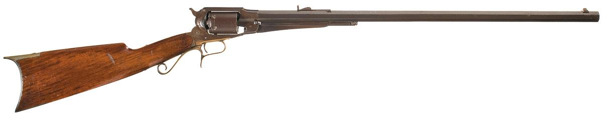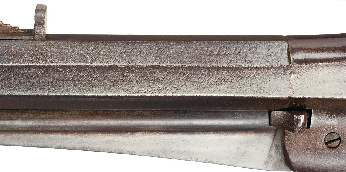 Manufactured from 1866 to 1879. Built on the frame of the New Model revolver series, these rifles had a slightly longer cylinder and a longer loading lever. This rifle is fitted with the rarely encountered 26 inch octagon barrel and is factory converted to .38 caliber rimfire with the specially installed conversion cylinder. The factory barrel markings are no longer visible, however, an inscription is legible on the upper and center left barrel flats: "Presented to I. NEILD / by the Employees of / Acker Merrall & Condit / Aug 1875". Founded in 1820, Acker Merrall & Condit is America's oldest wine shop that still operates to this day. Brass trigger guard and crescent buttplate, casehardened frame with the remaining surfaces blue. Matching numbers on cylinder pin and barrel, with the cylinder and cylinder conversion plate numbered "198". Smooth straight grip stock.