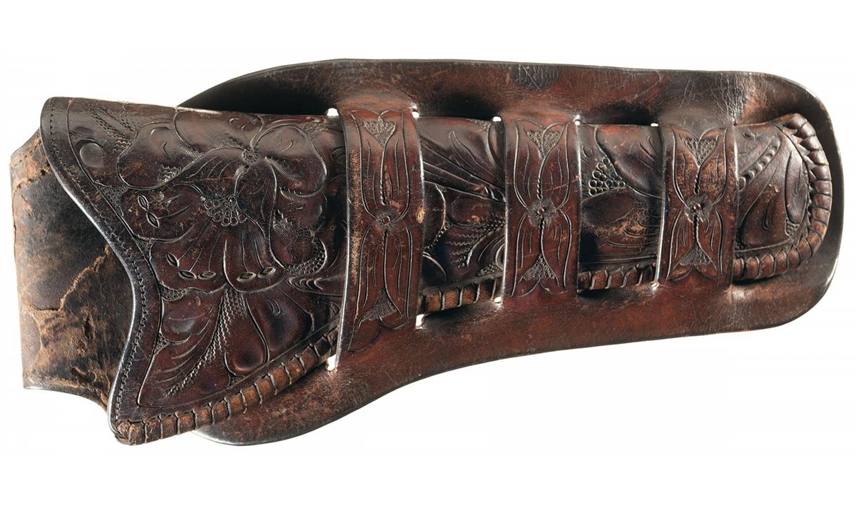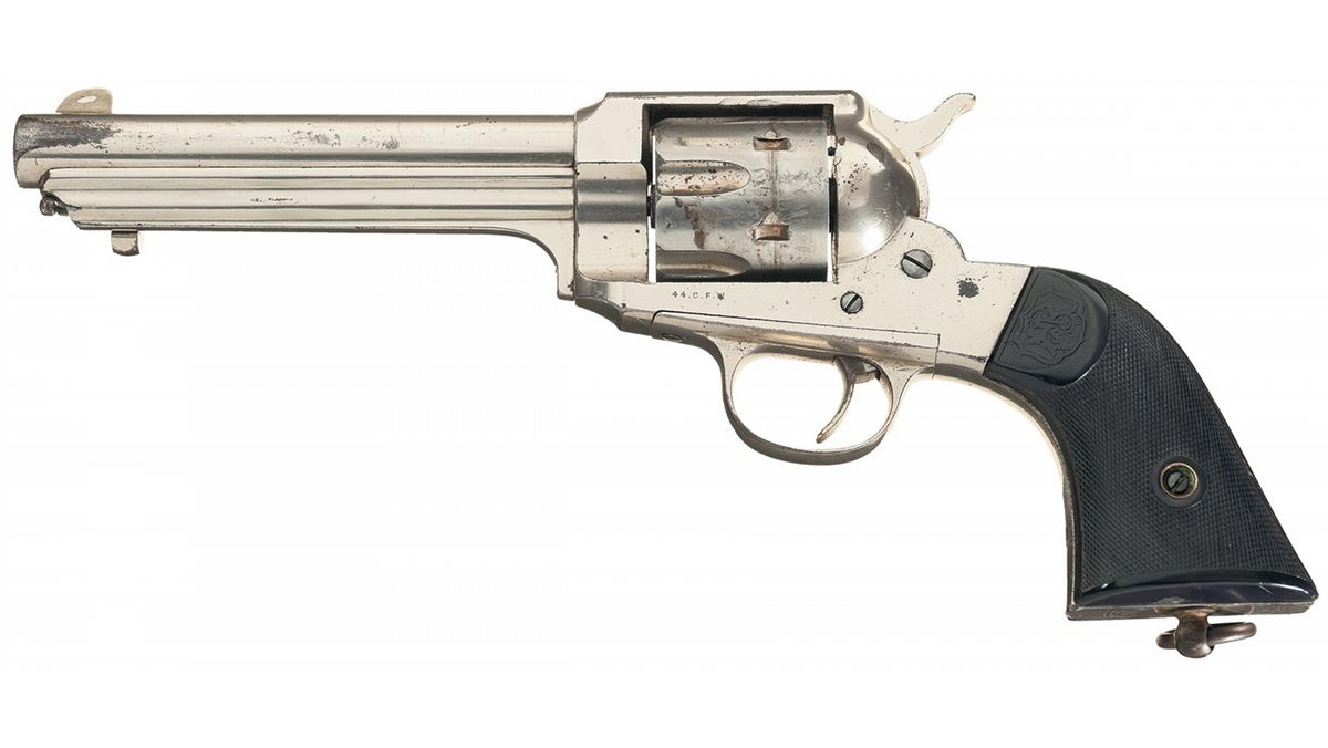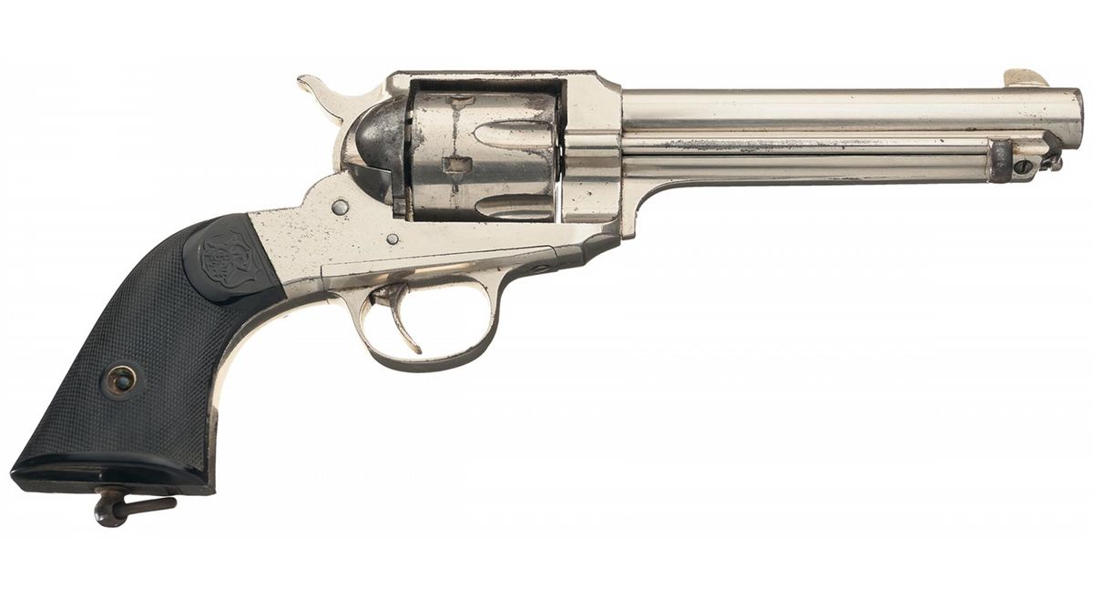 Remington only manufactured about 2,000 of the Model 1890 Single Action Army revolvers from 1891 to 1894. The Model 1890 was the successor to the Model 1875 and was intended to be the competitor of the Colt Single Action Army. This model of revolver is the most sought after of all of the Remington manufactured handguns. The revolver has the distinctive round barrel that lacks the web beneath the ejector housing found on Model 1875 Remington revolvers. The top of the barrel is marked "REMINGTON ARMS CO. ILION, N.Y." and "44 C.F.W" is marked on the left side of the frame just below the cylinder. The matching serial number is marked on the lower left side of the frame under the grip panel and on the loading gate. The revolver has a blade front (slightly modified), and frame notch rear sights, lanyard stud and ring mounted on the butt and is fitted with checkered hard rubber grips featuring the "RA" monogram at the tops. Comes with a floral tooled triple loop Heiser holster.