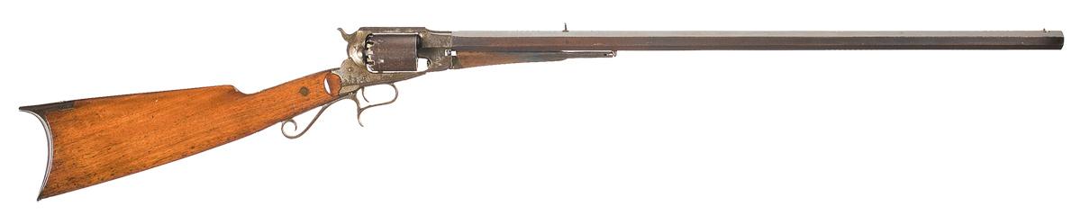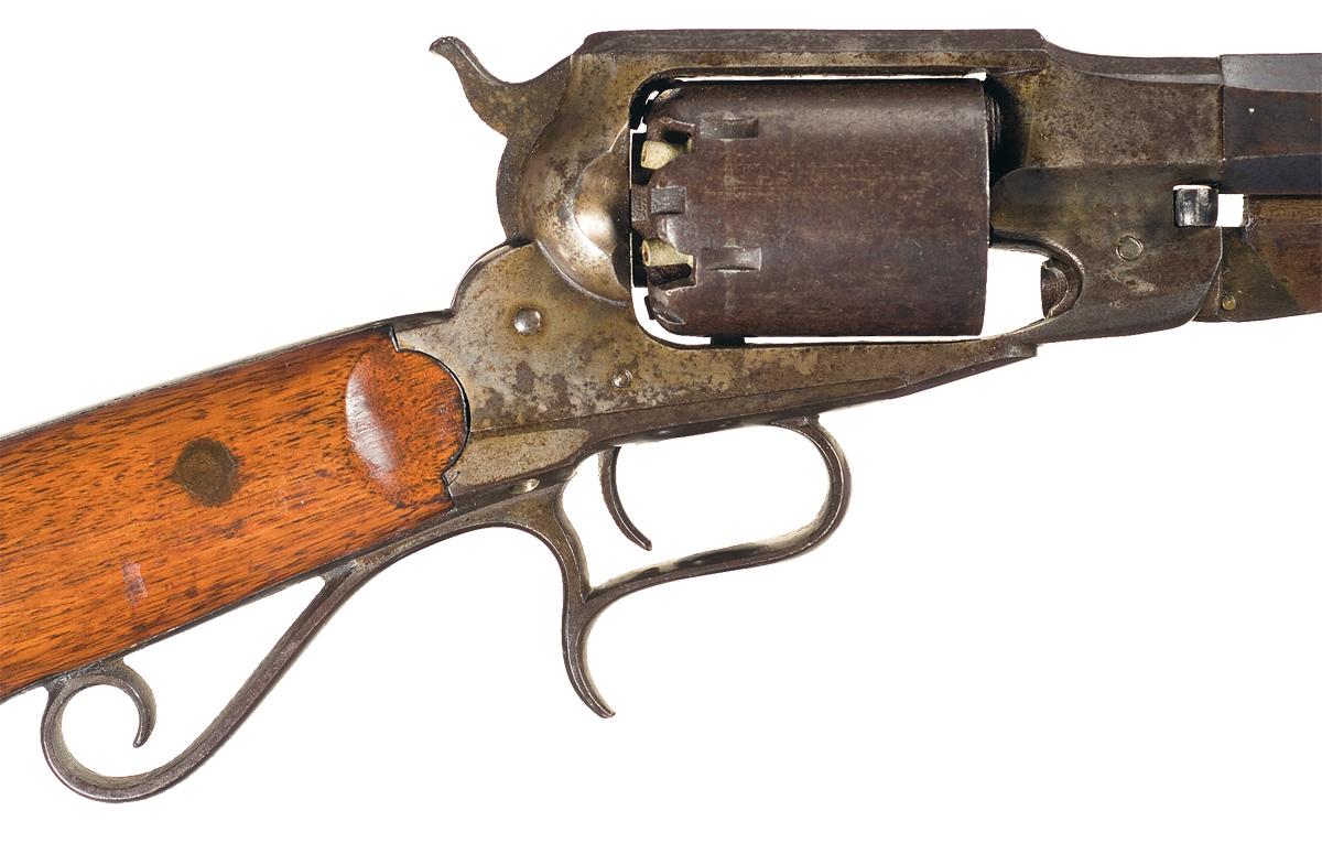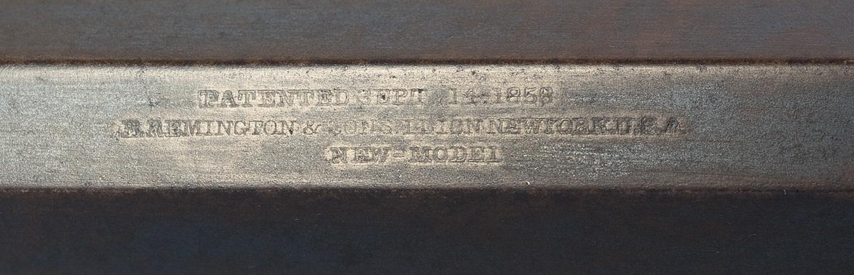 Produced 1866-1879, with total quantity estimated at less than 1000. This rifle features fixed sights on a barrel marked "PATENTED SEPT. 14, 1858 / E. REMINGTON & SONS, ILION, NEW YORK, U.S.A. / NEW MODEL". Casehardened loading lever and frame, marked "44" on the left side, with the correct style iron trigger guard with spur and scroll tang. Smooth straight grip stock with an iron buttplate. Most specimens have brass mountings, making this example even rarer.