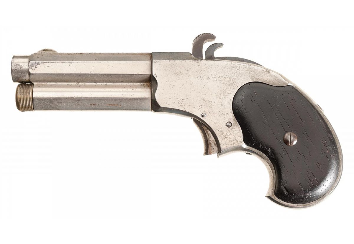 Manufactured from 1871 to 1888, with a total production of approximately 10,000, the Rider pistol was a Joseph Rider invention that is one of the most unusual 19th Century pocket pistols and one of the first handguns to feature a tube magazine. The pistol has a blade front sight with the rear sight being a hole in the cocking lever. The magazine loads from the muzzle end. The top barrel rib has the standard two line address and patent markings which reads "E. REMINGTON & SONS, ILION, N.Y./RIDERS PAT. AUG. 15, 1871". All nickel finish and fitted with smooth two-piece rosewood grips. Interesting enough the Remington magazine pistol is one of the few American firearms where engraved examples are more commonly encountered than the unembellished, plain example, such as this one. Comes with a high gloss modern "jewelry" case with a Edna Hibel "painting" on the lid, as well as contrasting and gold bordering and green velvet French cut lining with compartments for the gun and a box of cartridges (not included).