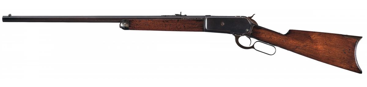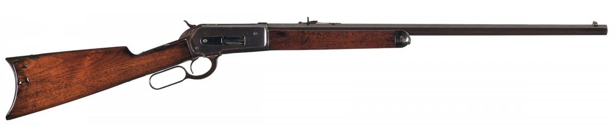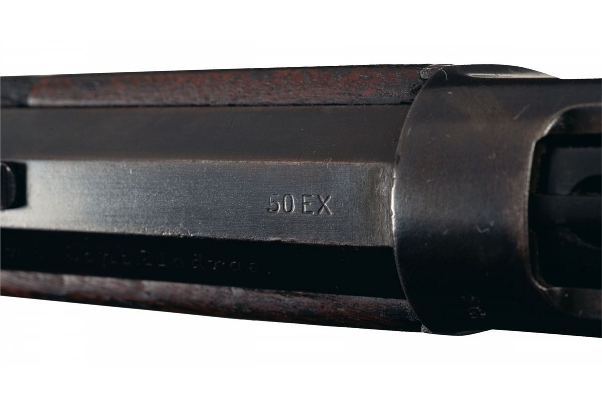 This desirable Winchester 1886 lever action rifle is chambered in the rare and desirable big "50 EX" cartridge. This specific rifle also carries the very desirable British proofmarks and is engraved on the barrel "Made For P. Orr & Sons. Madras." Now here is a rifle that if it could talk, could probably tell some real stories of "Big Game" hunting in the early 1900s in Madras India, now renamed Chennai. This city is actually located on the lower East side of India, about 200 km from the Sri-Venkateswarna National Park which was probably a major hunting area 120 years ago when this rifle arrived there. The 50 Express cartridge was touted by Winchester as an early Big Game, Lion and Elephant hunting cartridge and this rifle was clearly ordered by the Orr Company, probably intended to be used as their own personal hunting rifle in the early 1900s. The "P. Orr Company" was probably the most famous of all the watch and silver smiths working in India over the last 130 years. The brothers Peter and Alexander Orr emigrated from Scotland to India in 1843; Alexander, a lawyer set up his shop and flourished in his trade, while Peter, a well known watch and Chronometer maker also formally established his company in 1847 in Madras India. His business remained in continuous operation until 1967 when the company was sold to a private Silversmith Group in India. They were known as the "Timekeepers to Madras" for their operation of a large clock tower in the center of the city that housed their business. They were well know for the sale of the fine timepieces, and exquisite silver jewelry as well as for a brief time, firearms to wealthy and royal patrons throughout Southern India. The late 1800s and early 1900s was the heyday of Big Game hunting in India by many wealth British land owners and Aristocrats. This rare rifle has the standard two-line Winchester factory markings on top of the barrel in front of the rear sight and as noted is marked on the left rear flat "Made For P. Orr & Sons. Madras. The "50 EX" markings are on top of the barrel directly in front of the receiver. The rear left side of the barrel carries the British proofmarks of ".50 2.40" "110 GRS BLACKPOWDER 300 GRS BULLET", followed by the British Cross-scepters proofmark. The left side of the receiver and top of the breech bolt also carry the British "Crown/BP" proof marks as used by the Birmingham Proof house. It has the later one-line Winchester "MODEL 1886" model marking on the upper tang with the serial number "125485" stamped on the lower tang. It is fitted with a straight grip walnut stock with crescent steel buttplate with a recurve toe and walnut forend with a special order button magazine. It has the standard half-nickel sporting blade front sight with adjustable sporting rear sight.