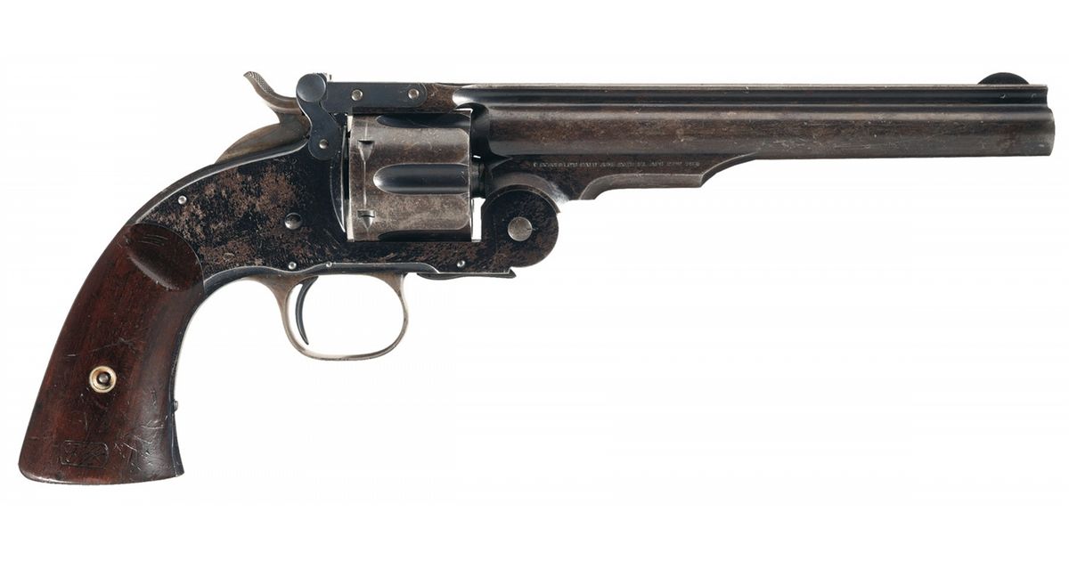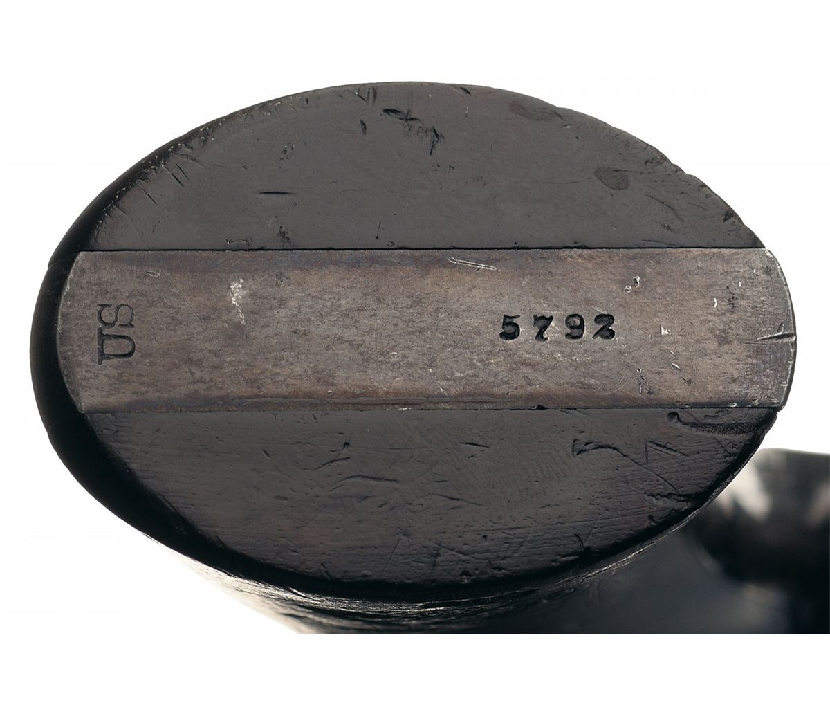 This revolver is one of approximately 300 Schofields that were issued from the Benicia Arsenal to the San Francisco Committee of Safety during the labor riots and civil unrest of 1877-78. The riots and unrest were a result of the great railroad strikes of 1877 that sprung up in many large cities across the United States. Records do exist of these 300 revolvers being issued however, no records exist of them being returned and it is popular belief that once the riots were put down all the revolvers were obtained by the California militia. The top of the backstrap features the hand stamped SFPD marking "326". The revolver has a high polish blue finish on the barrel, cylinder and frame. The trigger guard and hammer are casehardened and the two-piece walnut grips are oil-finished. The serial number, "5792", is located on the revolver butt and the rear face of the cylinder. The "U.S." property mark is stamped on the bottom of the butt. The left grip has a "JRJr" Inspectors cartouche over "1876" and the right grip is stamped with the "CW" Sub-Inspectors initials. Single Sub Inspector letters are stamped on the ejector housing, cylinder, and frame. The lower left side of the barrel lug is roll-stamped with the two line S&W patent markings with Maltese Crosses at either end. The right side of the barrel lug is roll-stamped "+SCHOFIELD'S PATs JUNE 20th 71. APR 22nd 73+" in a single line. With a factory letter, which documents the configuration of the revolver, and its shipment to Springfield Armory on 12 October 1876.