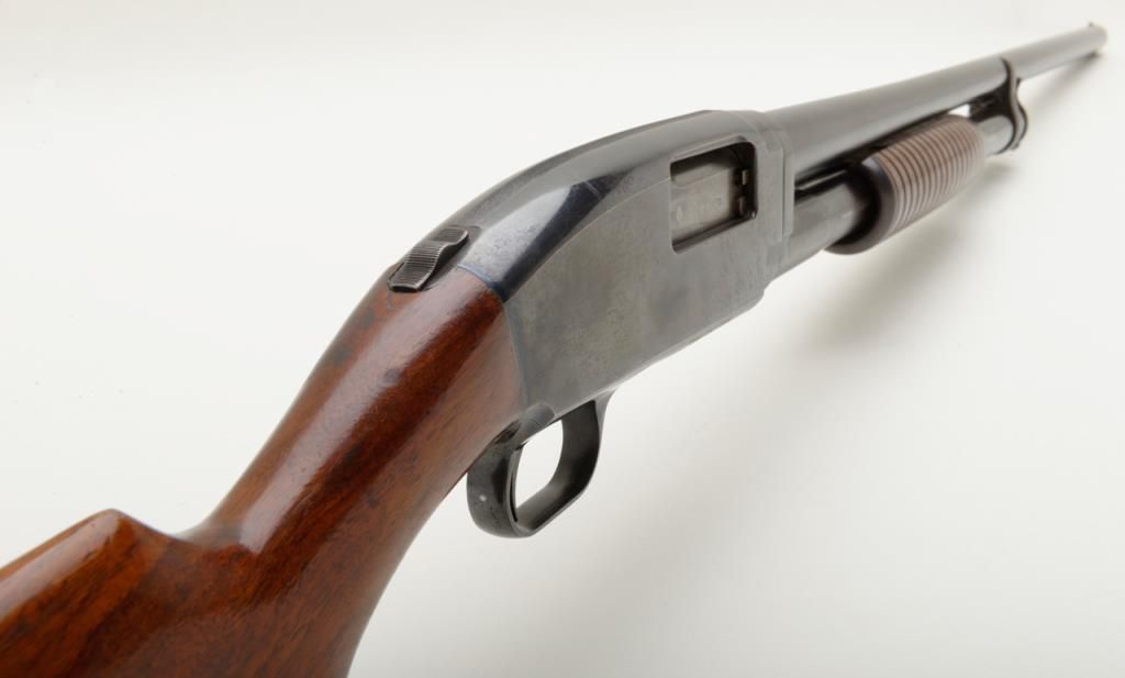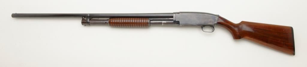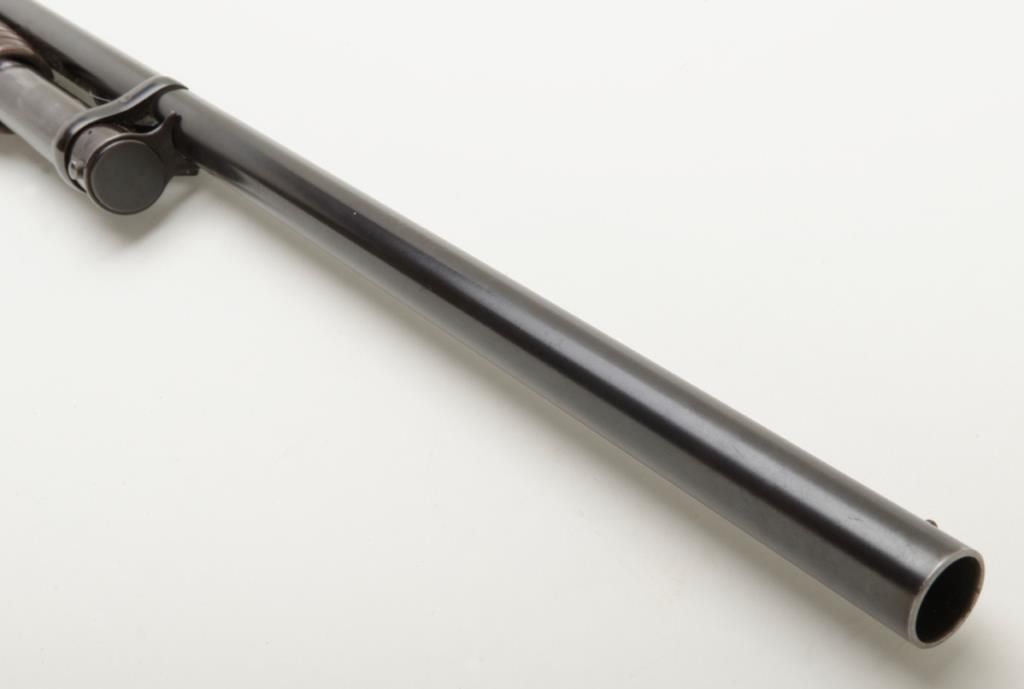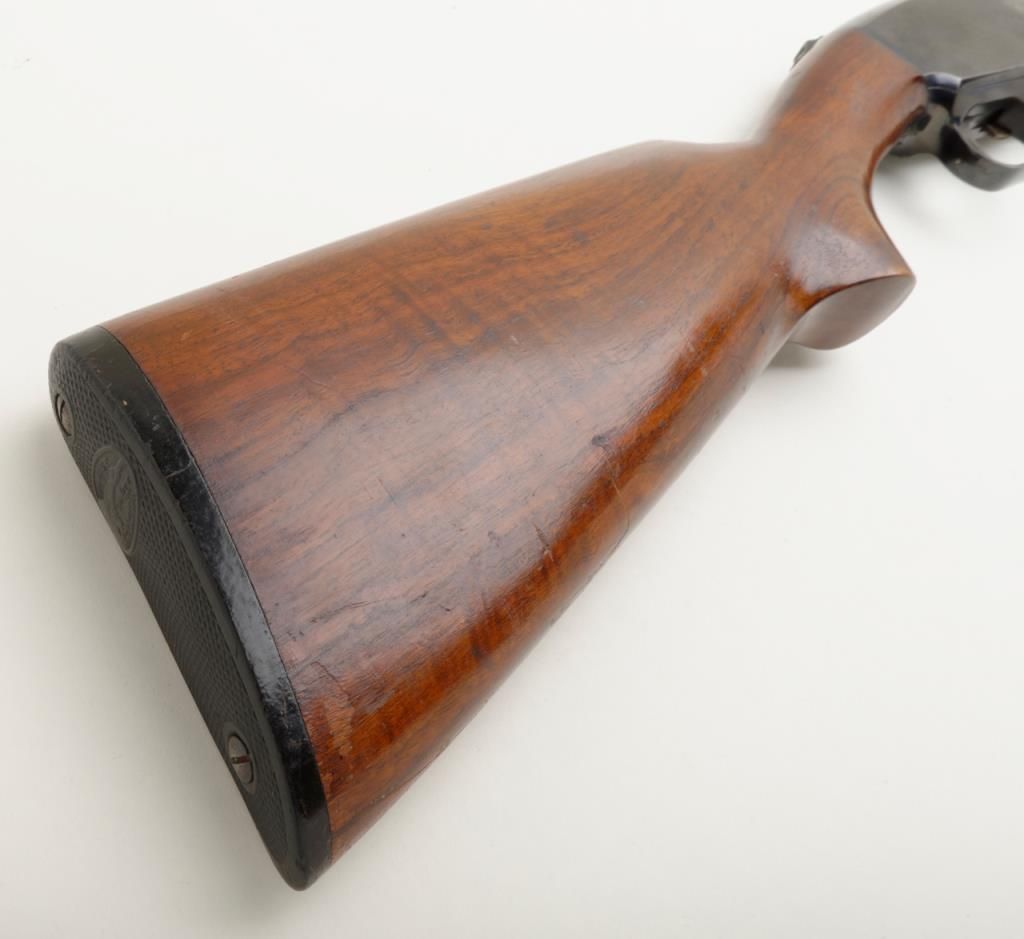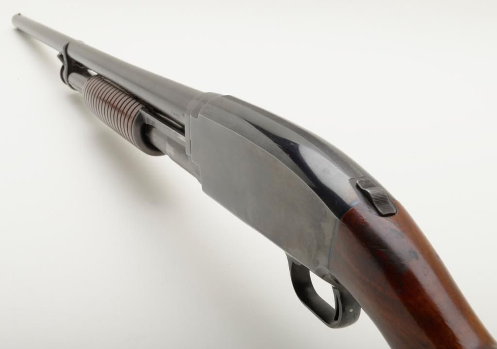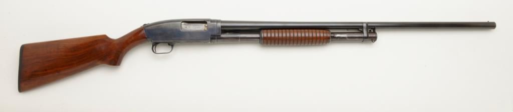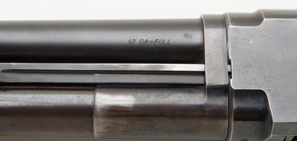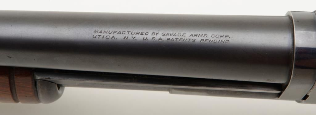 Scarce Savage Model 1921 pump action shotgun in 12 gauge with 30” round barrel, full choked, remaining in very good plus original condition, serial number 16409. The metal surfaces show 75% to 85% original blue evenly aging and toning with some minor losses at the high points and edges and just normal aging. The stocks are very good plus showing some slight scratches, minor dings, mars and about 80% to 90% original finish. The original hard rubber butt plate is retained. The action is good and the bore is very good. These Savages are very similar in appearance to the model 12 and are normally found worn out and not in this very good condition. Est.: $300-$600