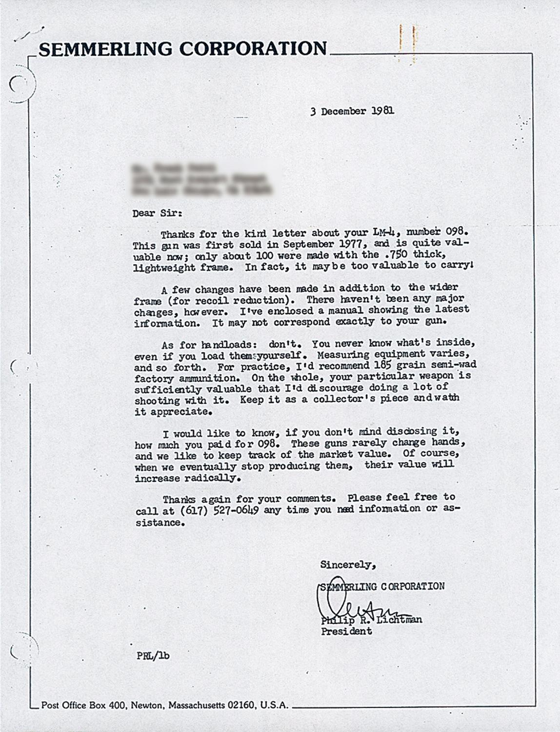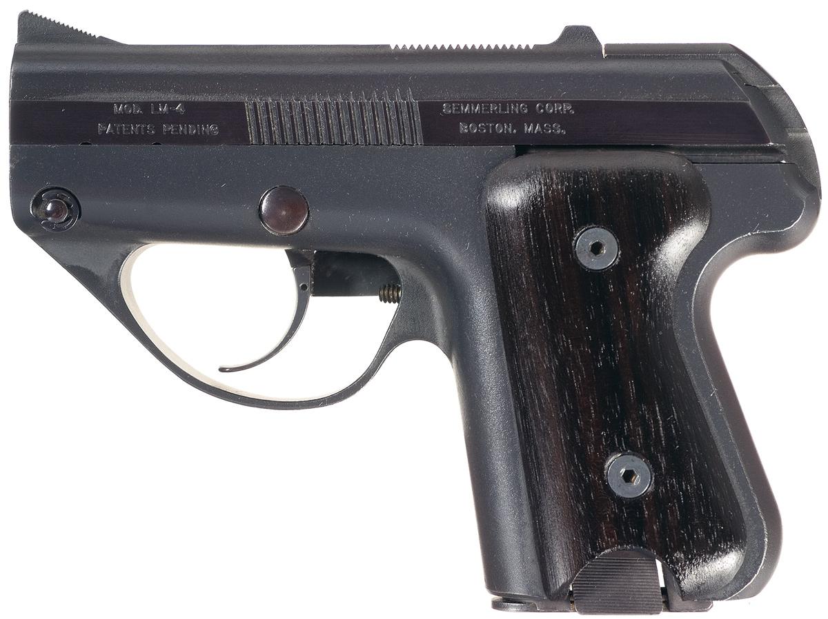 Produced in Boston, Mass, the LM-4 was designed expressly as a backup weapon, placing as much firepower in a compact space as possible. Chambered for 45 ACP and loading from a 5-round detachable magazine, the pistol is manually operated, extracting on the forward movement of the slide, chambering on the rearward, and firing in double action mode. Total measurements are 5 1/4" long, 3 3/4" tall and 1 1/4" wide across the grips. Marked "CAL. .45 ACP" and "STD. MIL. SPEC. CTG. ONLY" on the right side of the slide, "MOD. LM-4 / PATENTS PENDING" and "SEMMERLING CORP. / BOSTON, MASS." on the left. Smooth trigger, smooth black walnut grips and matte finish with polished slide sides and right side plate. With a copy of a 1981 letter from the President of Semmerling, describing a pistol 2 numbers higher as being produced in September 1977, using an early style lightweight frame, and stating that while such a weapon could be shot, it was, in the President's opinion, "too valuable to carry".