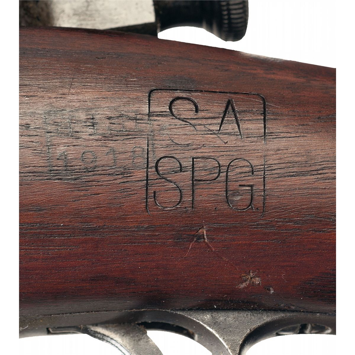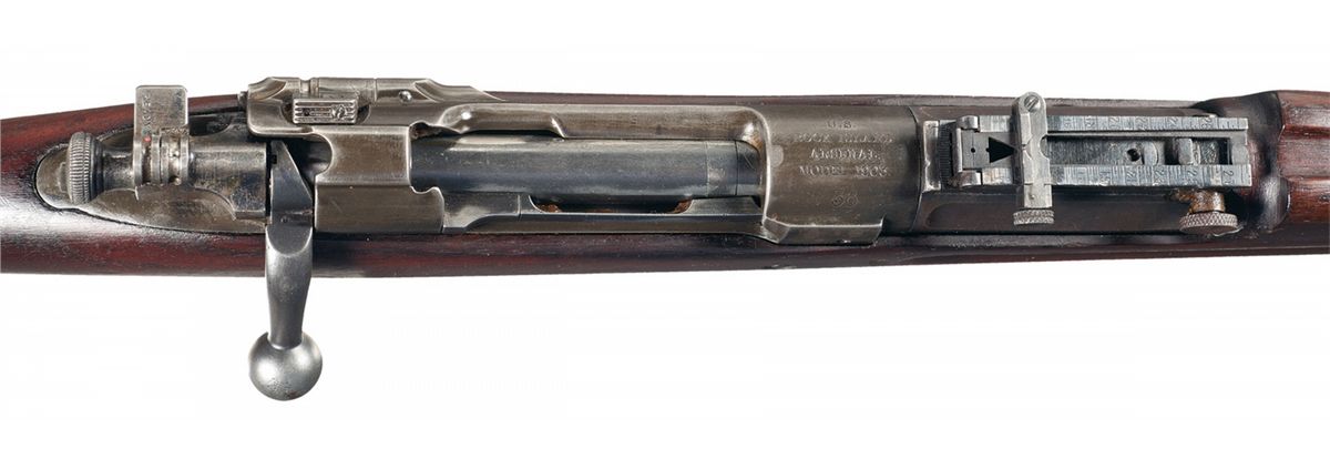 This early Rock Island Arsenal rifle originally had a rod bayonet and was originally chambered in 30-03 (now it is M1905 pattern in 30-06). Fixed front sight and ladder rear sight with 2,850 yard notch. The barrel is marked "RIA/flaming bomb/11-05" behind the front sight and the receiver has the standard markings. Mounted on a smooth walnut straight grip stock with finger grooves, filled in rod bayonet channel, two reinforcing bolts, boxed "J.L.?/1918" cartouche, boxed "SA/S.P.G." cartouche, two circled "P" proofs, sling swivels and a checkered steel buttplate with trapdoor (empty).