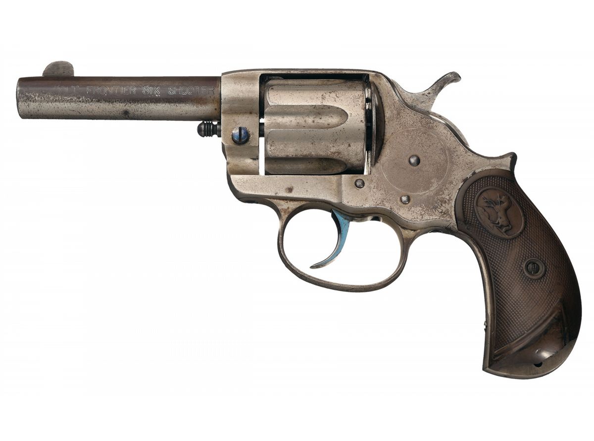 Manufactured in 1891 in the Storekeeper configuration, with the scarce 4 inch barrel and frame properly made without provision for an ejector rod. The barrel has the short two line Hartford address (double stamped) on top and "COLT FRONTIER SIX SHOOTER" stamped on the left side. Left side of frame has a circled Rampant Colt on the left side. Hammer and trigger are niter blue. Checkered hard rubber grips, with wedge designs at the bottom and Rampant Colt imprints at the top.