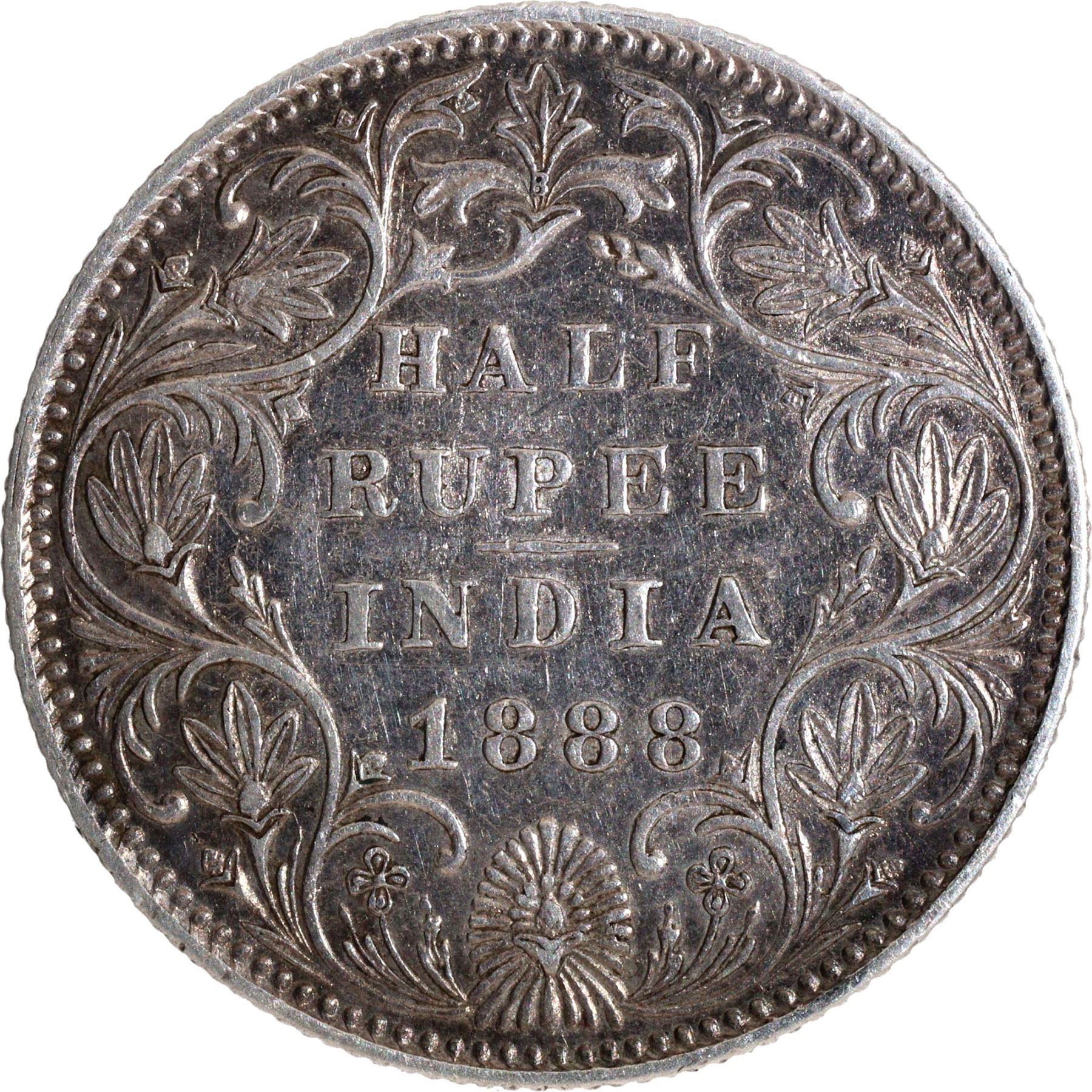 1888, Victoria Empress, Silver ½ Rupee, Bombay Mint, A/II(i)/B raised, (PR # 298/GK # 640), ghost image visible, little toning, hairline scratches, edge nick, about extremely fine, Scarce.