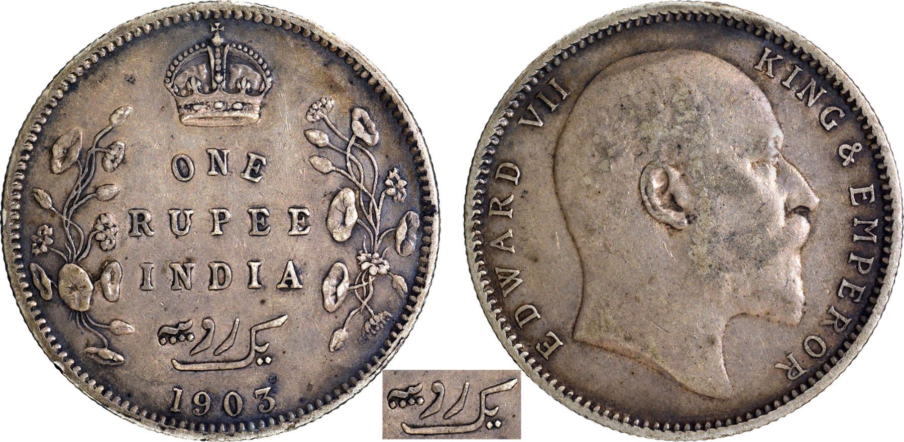 1903, King Edward VII, Silver Rupee, Calcutta Mint, 4 diamonds in Urdu inscription instead of 5 diamonds, no mm, (Unlisted in PR/GK # 923), toning, about extremely fine, Scarce.