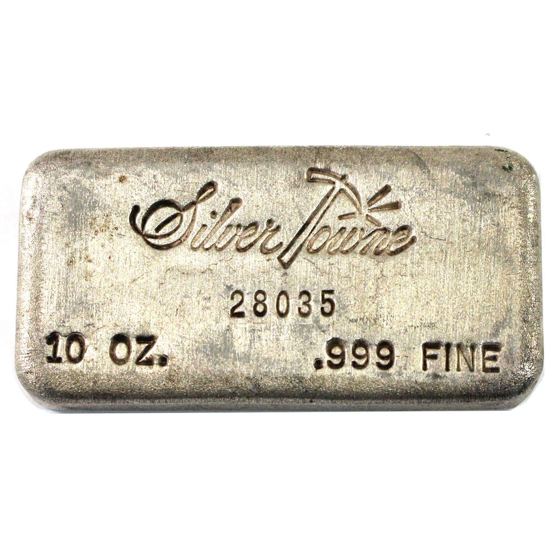 Scarce Silvertowne 10oz Fine Silver Bar. Serial #28035 with Waffle Pattern Reverse. 1st series 10oz class not produced by Silvertowne demonstrates a waffle pattern reverse which varied throughout the production run.
