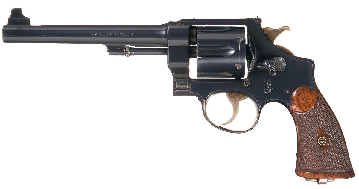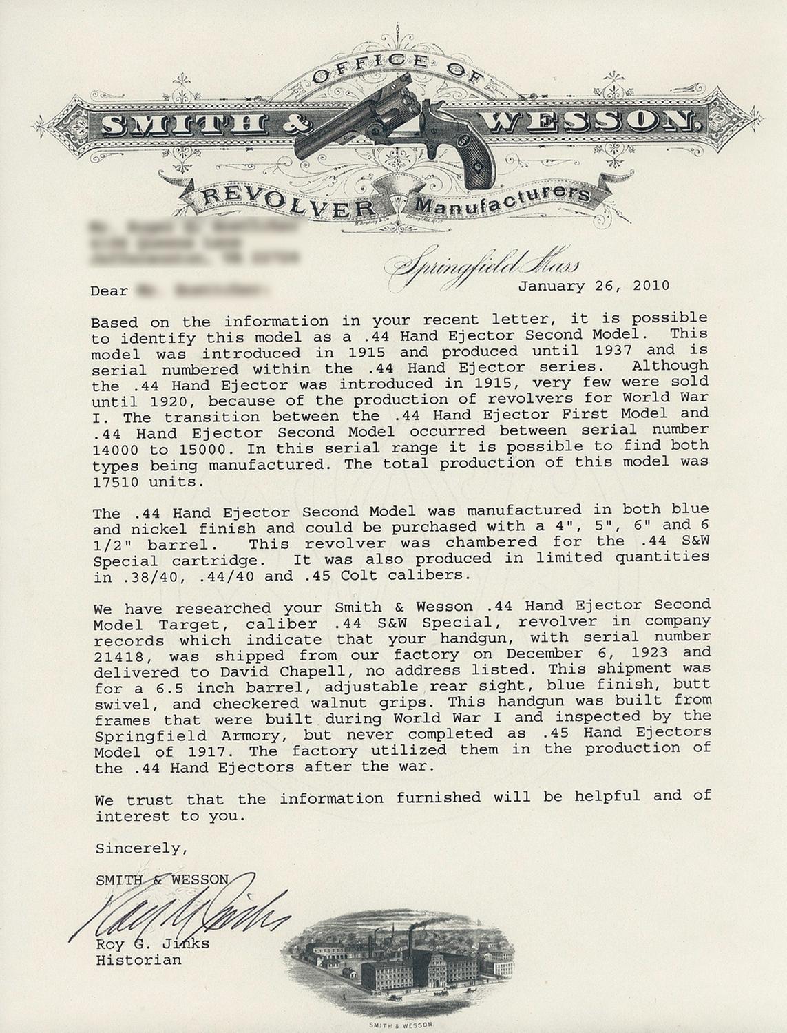 Manufactured in 1923. The top of the barrel is marked with the two line address/patent dates, "SMITH & WESSON" on the left side and the caliber designation on the right. Small S&W trademark logo on the left side of the frame and "MADE IN U.S.A." on the right. The revolver is equipped with a blade front and adjustable rear sights, casehardened hammer and trigger and fitted with checkered walnut grips with a diamond pattern around the screw. The accompanying factory letter verifies the serial number, 6 1/2" barrel, caliber, adjustable rear sight, blue finish, butt swivel, checkered walnut grips and that it was shipped to an individual, address unknown on December 6, 1923. The letter also states that the revolver was one of several that were made from Model 1917 45 Hand Ejector frames built during WWI and inspected by Springfield Armory, (no inspection marks), that were instead used in production of the .44 Hand Ejectors after the war.