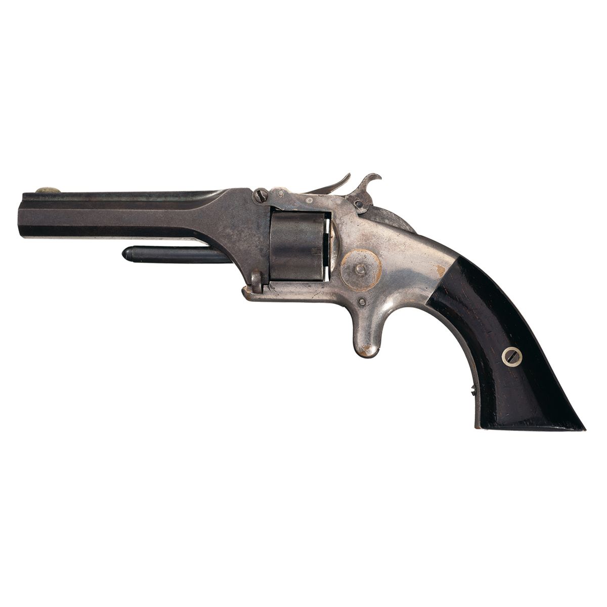 Condition: Very fine. The barrel and cylinder retain 50% original blue finish, with a smooth mottled brown patina on the balance. The frame retains 95% original silver plating. The grips are excellent with 97% original varnish, some lower edge wear and a few minor handling marks. The markings are clear. The action is fine.