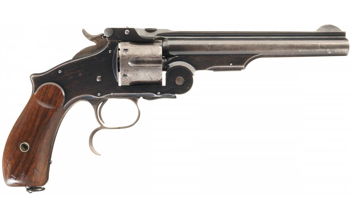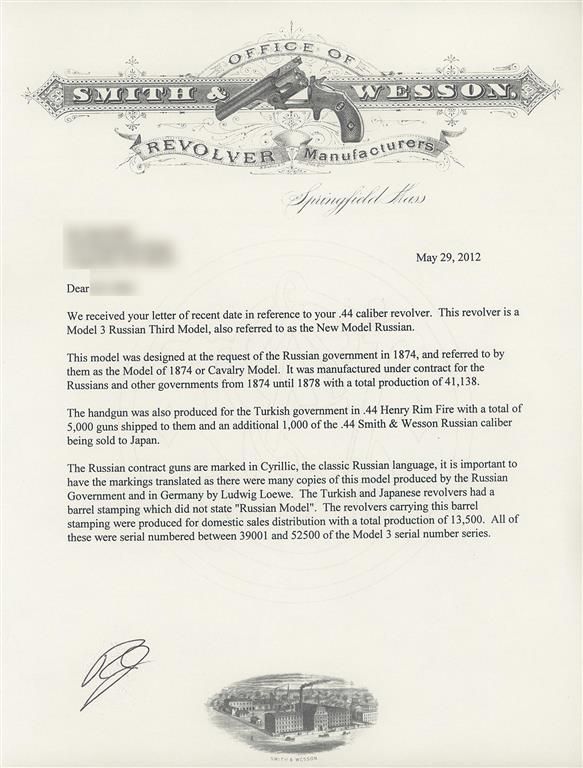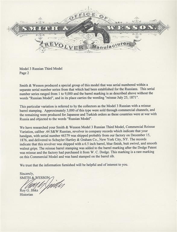 Smith & Wesson Model 3 Russian Third Model Revolver with S&W factory letter. The S&W letter describes the revolver a "Model 3 Russian with a reissue barrel stamping". The letter further states that S&W records indicate that the revolver was shipped from the factory on December 15, 1876 and delivered to Schuyler Hartley & Graham Co., in New York City. The revolver was shipped with 6 1/2 inch barrel, blue finish, butt swivel and smooth walnut grips. The top of the barrel rib is hand-stamped "REISSUE/JULY 25 1871". The revolver has the distinctive knuckle at the top of the backstrap and trigger guard spur. The top of the barrel rib is roll-stamped "+SMITH & WESSON SPRINGFIELD MASS. U.S.A. PAT.JULY 10.60. JAN.17.FEB.17. JULY11. 65& AUG. 24.69. RUSSIAN MODEL+". The butt is stamped "1874" in a rectangle above the serial number "46379". What appears to be an assembly number "7169" is stamped on the rear face of the cylinder.
