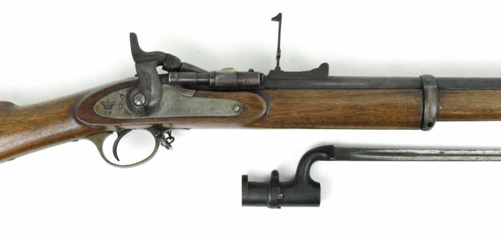 remaining in original configuration. An invention of Jacob Snider, conversion a simple way to convert muzzle loaders to cartridge firing breech loaders. Used by British Army 1868-1880's. Shows very good overall condition, complete with ramrod, barrel and breech show blue drifting brown patina, lock plate silver gray overall. Marked Enfield 1871. Walnut stock in very good condition, visible cartouches, shows extra coat of varnish. Excellent action, very good bore. NO FFL required. Includes original bayonet.