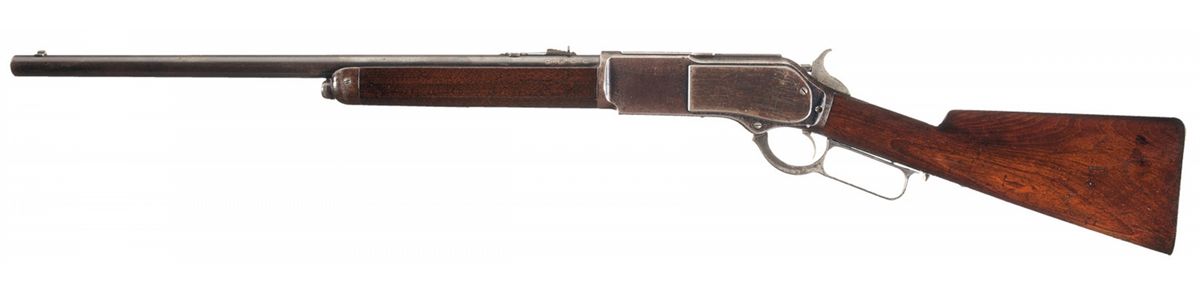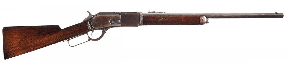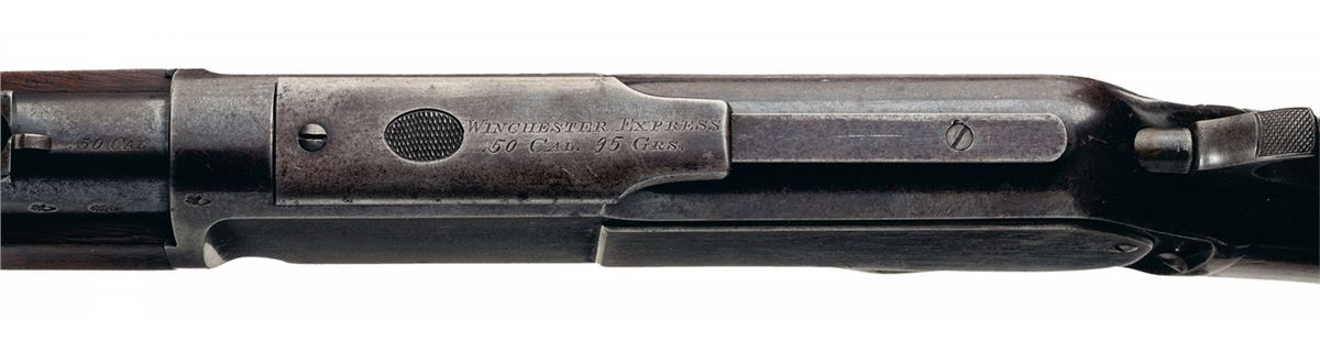 Winchester Model 1876 Short Rifle chambered for the .50-95 Express cartridge. The rifle has a 22-inch round barrel, half-magazine and shotgun buttplate. The rifle is accompanied by a Cody Firearms Museum letter that identifies the 50 express caliber, 22 inch round barrel/half magazine length and shotgun butt and states that the rifle was shipped from the Winchester warehouse on October 14, 1880. This early Second Model rifle has a dust cover with impressed oval thumbpiece and a guide secured to the receiver by screws. The barrel has a sporting style front sight with nickel-silver blade and a sporting style rear sight. The barrel, magazine and receiver are blue and the hammer and lever are color casehardened. The stock and forearm are straight grain black walnut with a varnish finish. The left side of the barrel is stamped with London proof and inspection marks. The right side of buttstock is lightly stamped with a London Armoury Jas. Kerr round stamp. The top of the dust cover is engraved "WINCHESTER EXPRESS/.50 CAL. 95 GRNS." in two lines. The model designation "MODEL 1876" is roll-stamped on the upper receiver tang in fancy letters. The top of the barrel is roll-stamped with the two-line legend "WINCHESTER'S-REPEATING-ARMS. NEW HAVEN. CT./KING'S-IMPROVEMENT-PATENTED-MARCH 29. 1865. OCTOBER 16. 1860" ahead of the rear sight. "50 CAL" is roll-stamped on the top of the barrel between the rear sight and the receiver. The caliber, "50-95", is stamped on the bottom of the cartridge elevator is script numerals. The serial number, "10804" is stamped in script on the lower tang between the lever latch and the tang screw. The Winchester Model 1876 Rifle chambered for the powerful .50-95 Express cartridge was popular with British colonial hunters. Winchester Model 1876 Short Rifles chambered for the .50 Express are very rare.