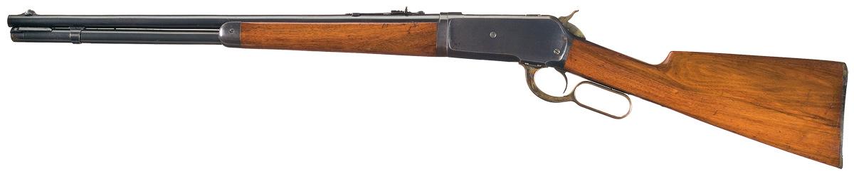 Condition: Excellent. The rifle retains 95% of the original blue finish. There is some edge wear on the end of the magazine tube and the bottom of the forearm cap. There are several minor spots of surface rust on the lower right side of the receiver. The niter blue finish on the loading gate has faded to a blue-gray patina. The hammer and loading lever have vivid case colors. The barrel and receiver markings are crisp. The stock and forearm are both in excellent condition with nearly all of the original varnish finish. Wear is limited to a few very minor handling marks. This is an excellent example of a scarce Winchester Model 1886 Extra Light-Weight Takedown Rifle