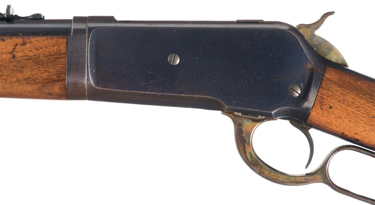 Condition: Excellent. The rifle retains 95% of the original blue finish. There is some edge wear on the end of the magazine tube and the bottom of the forearm cap. There are several minor spots of surface rust on the lower right side of the receiver. The niter blue finish on the loading gate has faded to a blue-gray patina. The hammer and loading lever have vivid case colors. The barrel and receiver markings are crisp. The stock and forearm are both in excellent condition with nearly all of the original varnish finish. Wear is limited to a few very minor handling marks. This is an excellent example of a scarce Winchester Model 1886 Extra Light-Weight Takedown Rifle