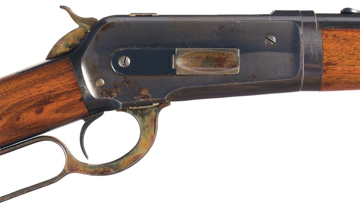 Condition: Excellent. The rifle retains 95% of the original blue finish. There is some edge wear on the end of the magazine tube and the bottom of the forearm cap. There are several minor spots of surface rust on the lower right side of the receiver. The niter blue finish on the loading gate has faded to a blue-gray patina. The hammer and loading lever have vivid case colors. The barrel and receiver markings are crisp. The stock and forearm are both in excellent condition with nearly all of the original varnish finish. Wear is limited to a few very minor handling marks. This is an excellent example of a scarce Winchester Model 1886 Extra Light-Weight Takedown Rifle