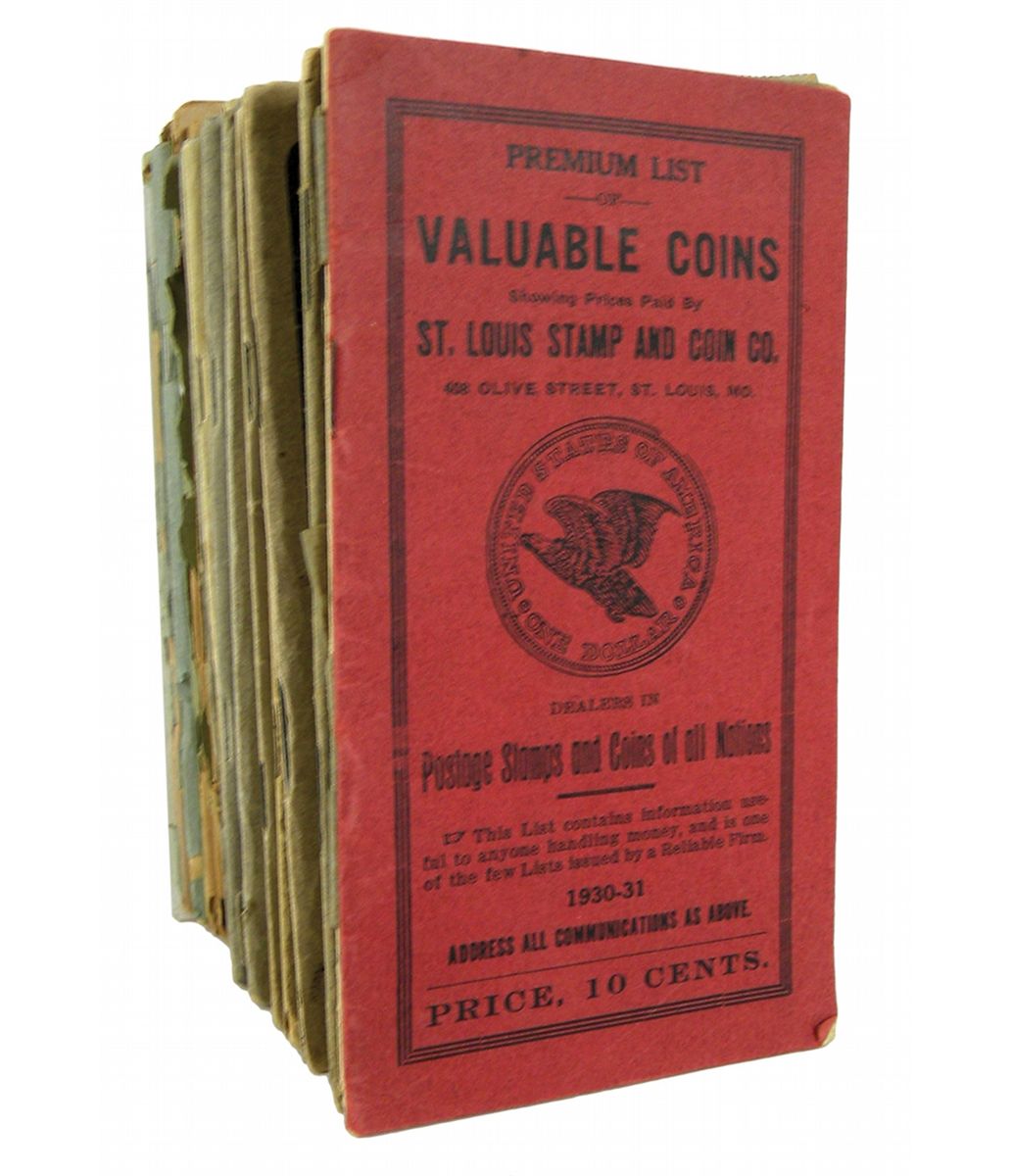 St. Louis Stamp & Coin Co. FIXED PRICE LISTS NOS. 1, 2, 4, 6, 10, 11, 12, 13, 15, 16, 18, 19, 20, 21, 23, 26, 27 (BOTH PARTS), 28, 30, 31 (PART TWO), 32, 33, & 34. St. Louis, c. 1905-29. 24mo, original printed card covers. Twenty-four catalogues, all in the original printed card covers; lot also includes a copy of a 1930-31 Premium List. A few covers a bit worn and/or loose, with some chipping; text of some issues browned as usual but generally a near fine run. Very scarce. Originally owned by F.E. Ellis, Burdette G. Johnson and D.A. Sutherland purchased the firm in 1907 and Johnson became sole owner the following year. A dealer's dealer, Johnson marketed his extensive stock via auctions (until 1915), the series of price lists offered here, and primarily, through private transactions. The price lists present here are, however, not without highlights. No. 11, for example, featured portions of George Rice's collection, including Indian peace medals and numismatic books. Bourne pages 115-117. Ex Michael Spurlock library.