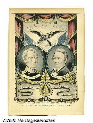 <B>Scarce Taylor and Fillmore Grand National Banner Print</B></I> 10" x 14" hand-colored small folio lithograph published by Nathaniel Currier in 1848, titled "Grand, National, Whig Banner. Press Onward." It also contains a subtitle: "If We All Pull Together, We Can't Be Beat." We can't recall seeing this particular variety before. Colors include blue, yellow, green, red and flesh tone. Condition is excellent on this fine display piece. Lot:256