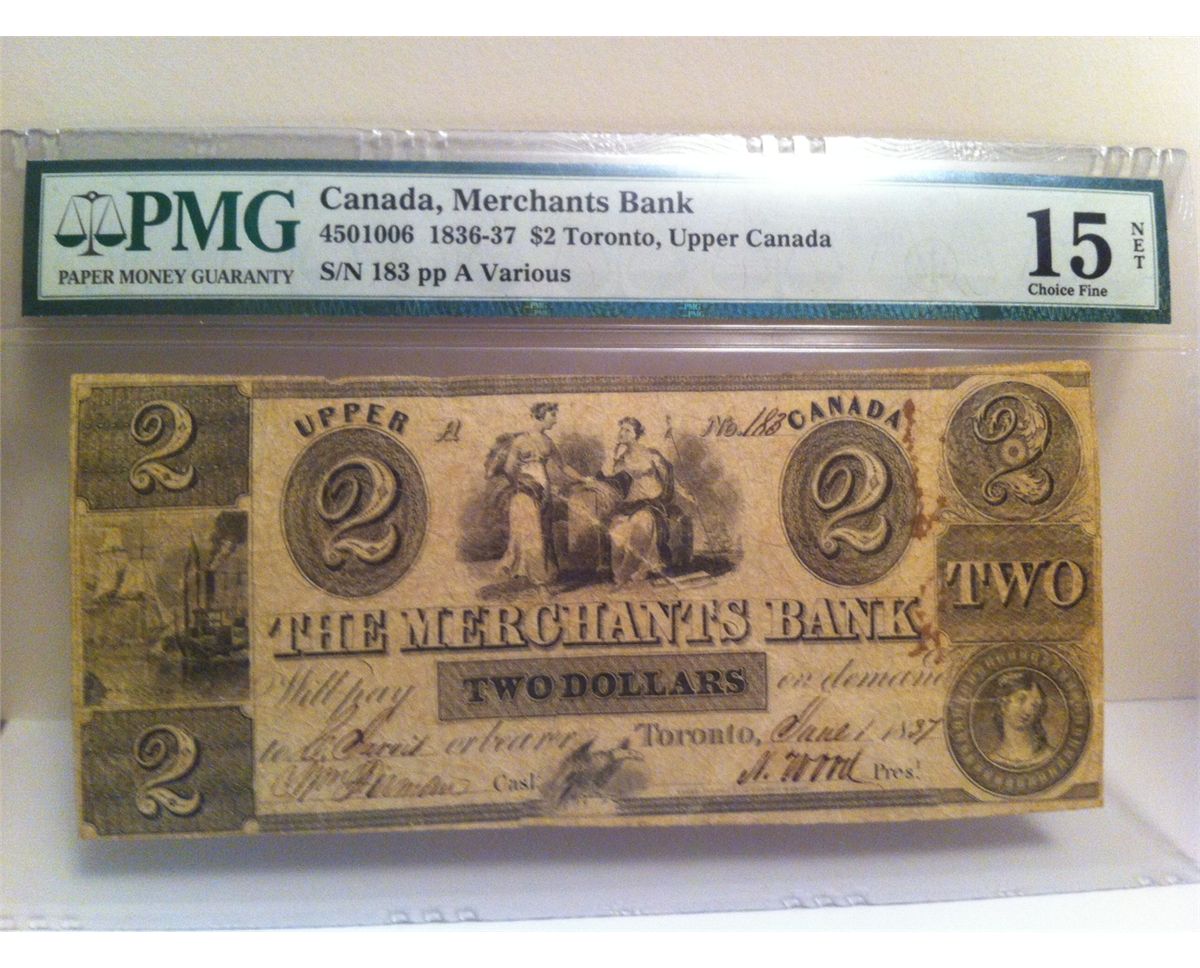 This is a very scarce, low S/N banknote. This is a must have in the collection. 1837 $2 Toronto, Upper Canada. S/N 183. Plate A .Ink burn.