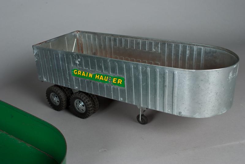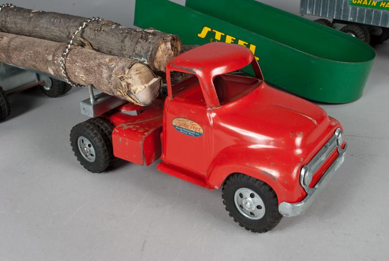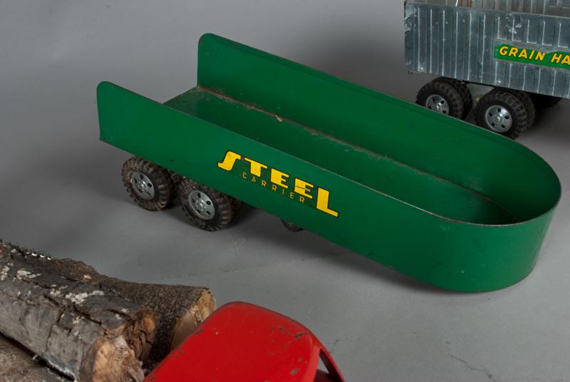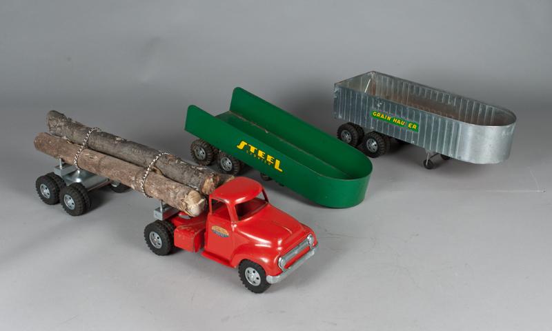 To include a cab, a grain hauler, a steel carrier and the logging trailer, all in very good to excellent with minor sporadic paint loss mostly on the cab roof and steel carrier bed., circa 1960s.