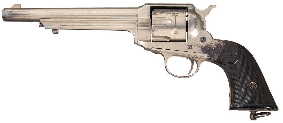 Remington only manufactured about 2,000 of the Model 1890 Single Action Army revolvers from 1891 to 1894. The Model 1890 was the successor to the Model 1875 and was intended to be the competitor of the Colt Single Action Army. This model of revolver is the most sought after of all of the Remington produced handguns. The top of the barrel is marked "REMINGTON ARMS CO. ILION, N.Y." and "44 C.F.W" on the left side of the frame just below the cylinder. The grips have been secured in such a manner that they can not be removed, so writer is unable to verify the serial number. The revolver has a blade front and frame notch rear sights, lanyard stud and ring mounted on the butt, and is fitted with checkered hard rubber grips with the "RA" monogram at the tops.