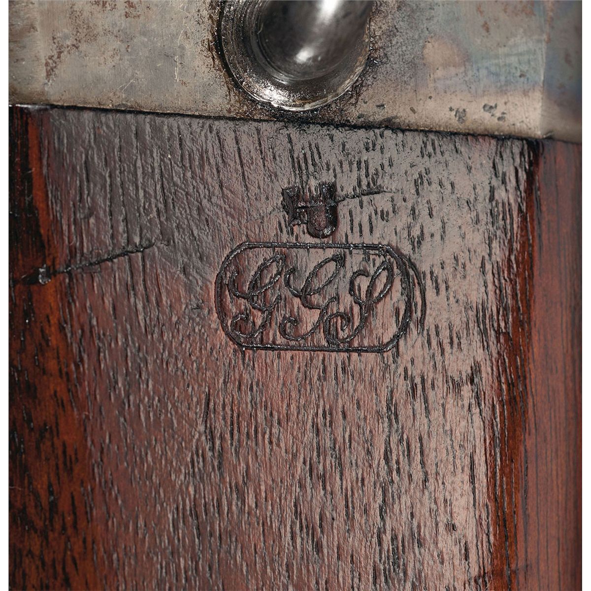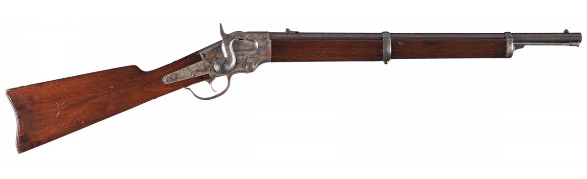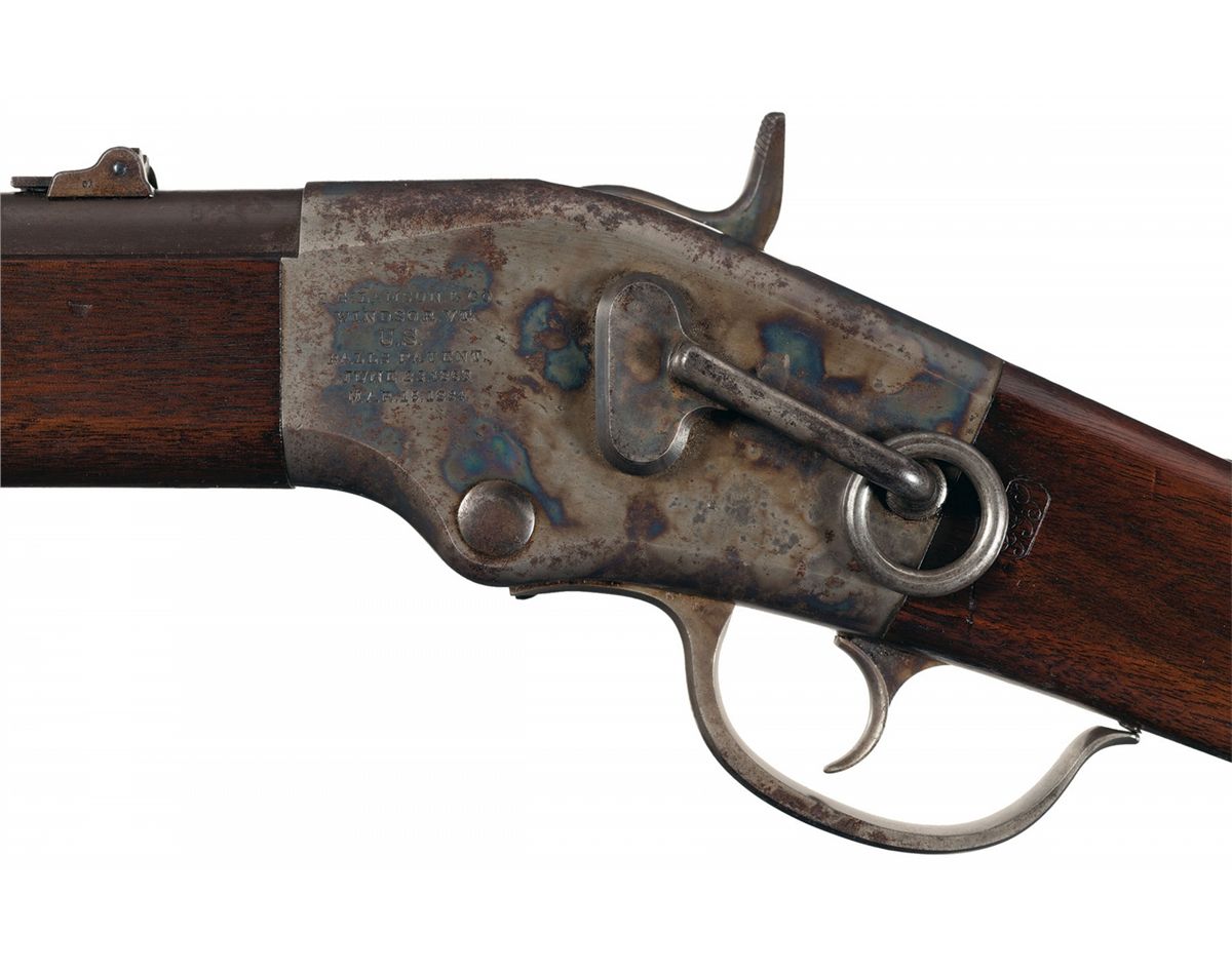 Approximately 1,002 of these carbines were manufactured as part of a government contract during the Civil War. The left side of the receiver is marked "S/E.G. LAMSON & CO./WINDSOR, VT./U.S./BALLS PATENT./JUNE 23, 1863/MAR. 15, 1864". There is a small "S" stamped on most of the components and a small "GGS" stamped on the bottom of the forearm. The left side of the receiver has a saddle ring. Blade and two leaf folding sights, cleaning rod on the right side of the forearm and smooth forearm and straight grip stock. The left wrist has a clear "GGS" cartouche.