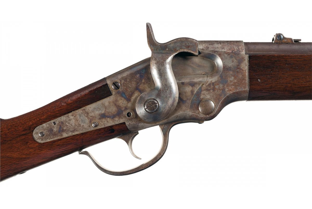Condition: Fine. The barrel retains 40% faded original blue finish in the protected areas with the balance a smooth brown patina. The receiver, hammer, lever and buttplate retain 60% plus original case colors. There is some minor spotting. The wood is excellent with some scattered minor handling marks. Mechanically excellent.