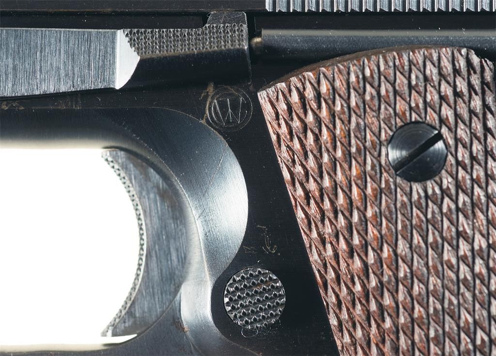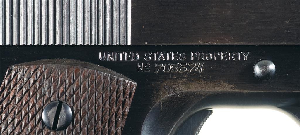 Also known as the Improved Model 1911 Pistol, the Transitional 1911's were made in 1924, and while they retained the nomenclature markings of the 1911, they were equipped with the signature features of the 1911A1, including the dished frame sides, shortened trigger, and arched mainspring housing. Round blade front and flat top notch rear sights, with the two-line, two-block address and patent markings divided by the Rampant Colt logo on the left side of the slide, "MODEL OF 1911.U.S.ARMY" on the right, and "H" above the firing pin block. The frame bears the circular Walter Gordon "WTG" inspection stamp, with the short milled trigger, wide hammer, long grip safety, checkered mainspring housing, fully-checkered hardwood grips, "A" marked pinned base two-tone magazine and a correct, Colt barrel with conjoined "HP" on top of the chamber and a letter "K" proof on the underside of the stepped barrel.