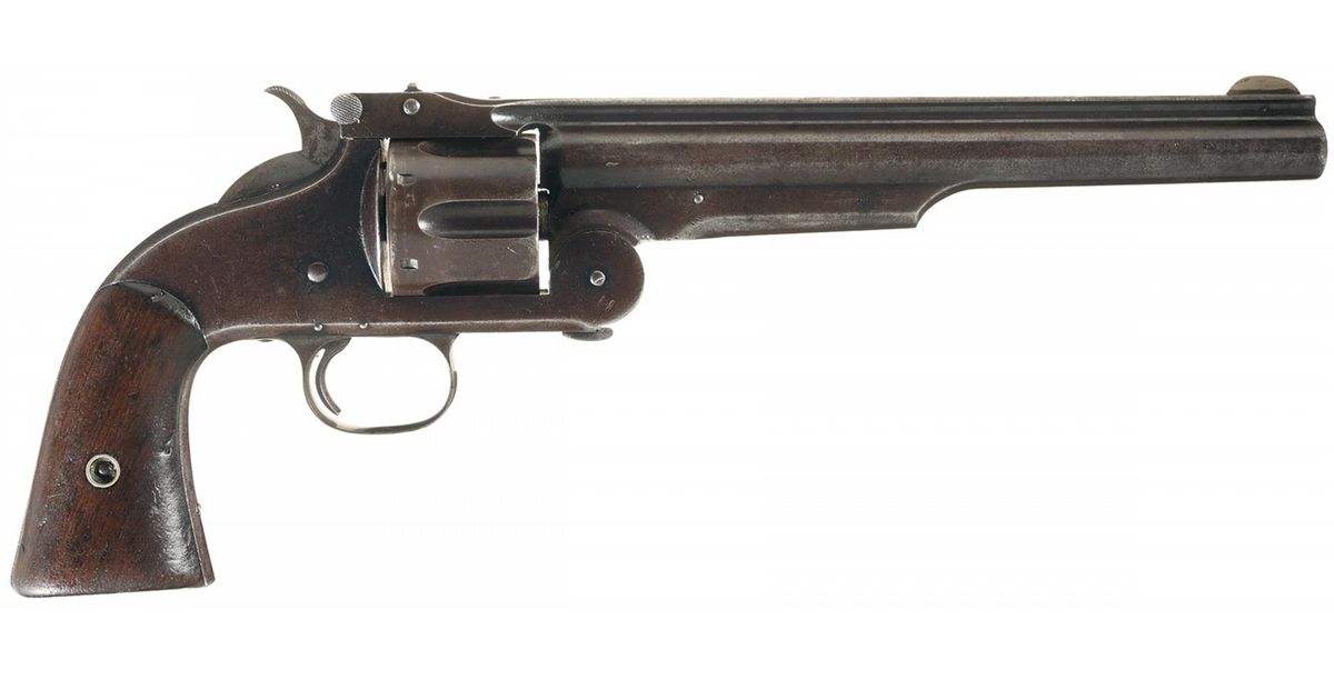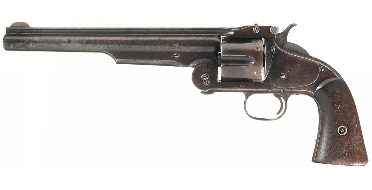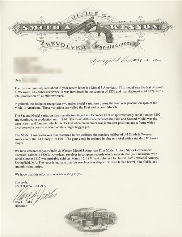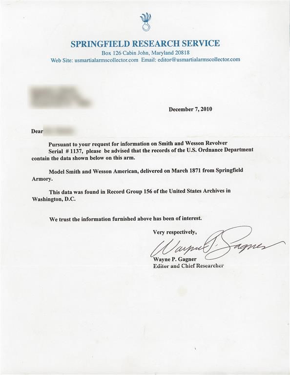 Smith & Wesson First Model American Revolver with S&W and Springfield Research Service letters. Both letters identify the revolver as an S&W First Model American and state that it was delivered to the Springfield Armory in March 1871. The Ordnance Department purchased 1000 First Model American revolvers from S&W in 1871; surviving examples are scarce and highly desirable. The revolver has the S&W commercial blue finish with casehardened hammer and barrel latch. The two-piece walnut grips are oil finished. The barrel has a nickel-silver half-moon front sight and the frame has the oil hole in the bottom. The top of the barrel rib is roll-stamped: "+ SMITH & WESSON SPRINGFIELD MASS.U.S.A.PAT.JULY 10. 60. JAN. 17. FEB. 17. JULY 11. 65 &AUG. 24. 69 + " in a single line with maltese crosses at either end. "US" is stamped on the top of the barrel between the legend and the barrel latch. Small "A" Ordnance sub-inspection marks are stamped on the bottom of the frame behind the oil hole, on the left side of the frame above the trigger guard and on the left side of the barrel top strap. An Ordnance "P" proof mark is stamped on the right side of the barrel ahead of the hinge, in one cylinder flute and on the right side of the frame behind the recoil shield. The Ordnance Sub-Inspection mark which consists of the script initials "OWA" (Orville W. Ainsworth) in a rectangle is stamped on the lower left grip. The rear face of the cylinder and the underside of the cylinder latch are stamped with the assembly mark "L2". The serial number, "1137", is stamped on the butt.