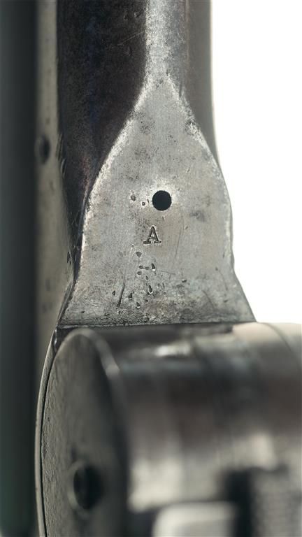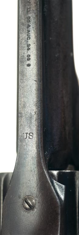 Good. This scarce revolver is all original and retains 40% of the original blue finish; the balance of the revolver has toned to a deep brown patina. The barrel, frame and cylinder have some surface texturing and some scattered dents and scratches . There is light flash pitting on the muzzle, on the frame near the cylinder and on the forward edges of the cylinder. The factory markings and Ordnance property mark, sub-inspection marks and proof are clear. The grips are in good overall condition with moderate handling wear; the edges of the heels are rounded and the grips have minor dents and scratches. The Ordnance sub-inspection mark on the left grip is faint but legible. The action is tight and functions well. This is a good example of a scarce U.S. Contract S&W First Model American Revolver. Often the missing link in even the most advanced U.S. military and S&W collections.