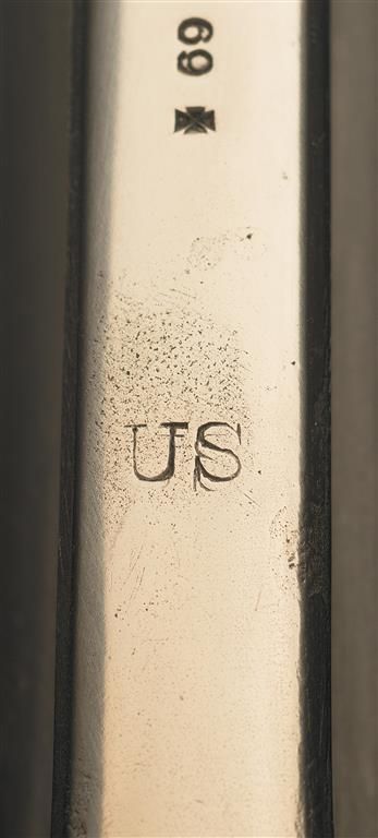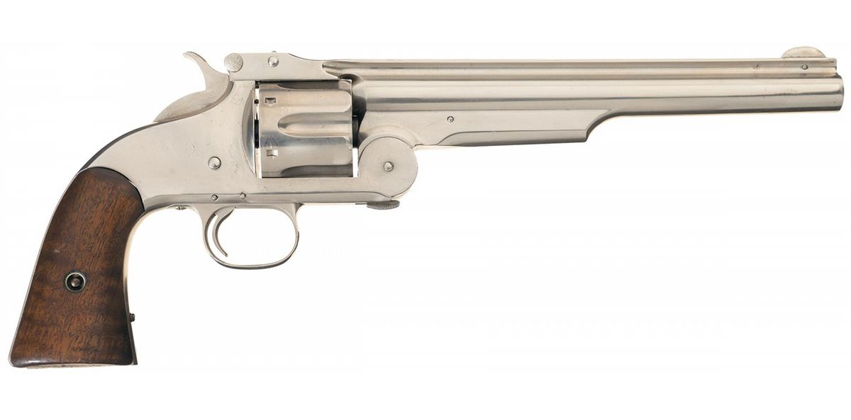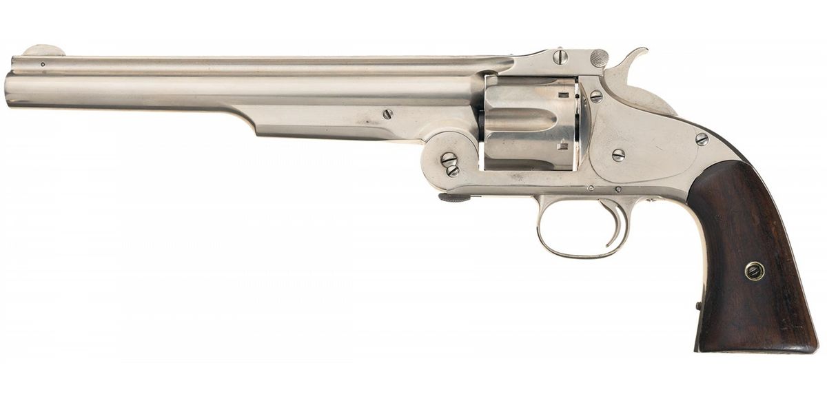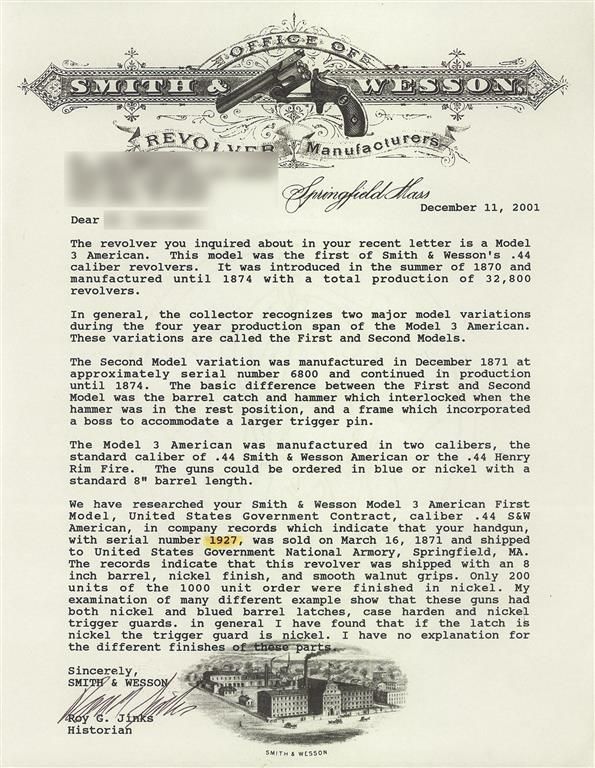 As confirmed by the included factory letter this S&W Model 3 American First Model Revolver was sold on March 16, 1871 and shipped to the United States Government, National Armory, Springfield, MA. The revolver was part of a shipment of 1,000 units, 800 blue finish and 200 in nickel finish. The letter confirms the 8 inch barrel and smooth walnut grips and was originally shipped with the very rare nickel finish (only 200 were manufactured for the contract in nickel). Surviving examples of U.S. martial Model 3 Americans are scarce and highly desirable. The barrel rib is marked "+ SMITH & WESSON SPRINGFIELD MASS.U.S.A.PAT.JULY 10. 60. JAN. 17. FEB. 17. JULY 11. 65 &AUG. 24. 69 +" followed by "US". A small "A" ordnance sub-inspection mark is present on the left side of the frame under the cylinder, a cylinder flute and barrel top strap. All nickel finish. The serial number is marked on the butt with the right grip panel stamped with the number "22762." The rear of the cylinder, barrel latch and the barrel are marked "E2."