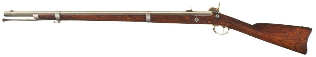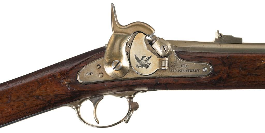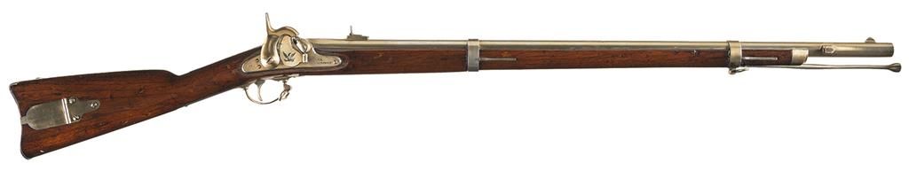This is one of an estimated 5,151 later production Model 1855 percussion rifles with a 33 inch barrel, two barrel bands and iron mountings, including an iron patch box, manufactured by Harper's Ferry for the U.S. government from 1857 to 1861. Most of the iron mounted rifles were issued to militia units and a number were shipped to Southern states prior to the outbreak of the Civil War. The Harpers Ferry arsenal was abandoned by the Union Army on April 18, 1861, six days after the first shots were fired at Fort Sumter, and was occupied by Confederate units that included "Stonewall" Jackson's Virginia militia until June 18, 1861. The Confederates had a desperate need for weapons, and produced many mini muskets as possible before abandoning the Arsenal. Any Harpers Ferry rifle dated 1861, as this one, was therefore either issued to Union soldiers prior to, or during the early days of the Civil War, or was issued to Confederate soldiers or Virginia militia units. The limited number of Model 1855 Rifles saw heavy use with both the Federal and Confederate Armies throughout the Civil War and many were destroyed when the Confederates burned the factory. As a result, the survival rate of these rifles is low and examples in very good or better condition are very scarce. These rifles featured the Maynard tape primer and percussion bolster with clean out screw. The barrel has been counter bored, absent of rifling on the first 1/4 inch at the muzzle. The rifle is equipped with a blade front sight, three leaf rear sight with "1", "3" and "5" graduations, and a bayonet lug on the right side of the barrel 3 1/2 inches back of the muzzle. The lock plate is dated "1861" at the rear and "U.S./HARPER'S FERRY" is stamped ahead of the Maynard primer door. The primer door has an American eagle motif. The breech end top of the barrel is also dated "1861" with "V/P/Eagle Head" proof on the left side at the breech. Both barrel bands are stamped with the letter "U". Tulip head iron ramrod with a swollen shaft, sling swivel on the front barrel band and front of the trigger guard and mounted with a smooth full length walnut stock with a faint oval cartouche on the left flat and iron carbine style buttplate marked "US" on the tang. Comes with a wooden muzzle tampion.