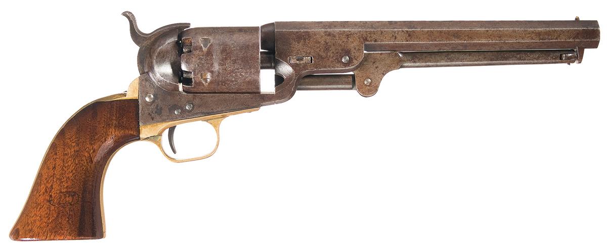 Manufactured in 1857, this revolver is one of Colt Model 1851's that was purchased by the U.S. Army prior to the Civil War. These U.S. Colt Model 1851's were primarily issued to the 1st and 2nd Cavalry Regiments and were used extensively in campaigns against hostile Indians prior to the Civil War. The top barrel flat is marked "-- ADDRESS SAML COLT HARTFORD, CT.--", the left side of the frame is marked "COLTS / PATENT / U.S." and the cylinder is round engraved with the Texas naval battle scene. The top barrel flat at the breech is marked with the single initial sub-inspectors mark "C", "S" on the left side to the right and above the wedge screw and an "S" on the cylinder. The complete matching serial number is marked on the barrel, frame, trigger guard, cylinder and backstrap with the partial number "9006" on the loading lever and arbor pin, and the period replacement wedge is un-numbered. Fitted with smooth one piece walnut grip with a faint oval cartouche on each side.