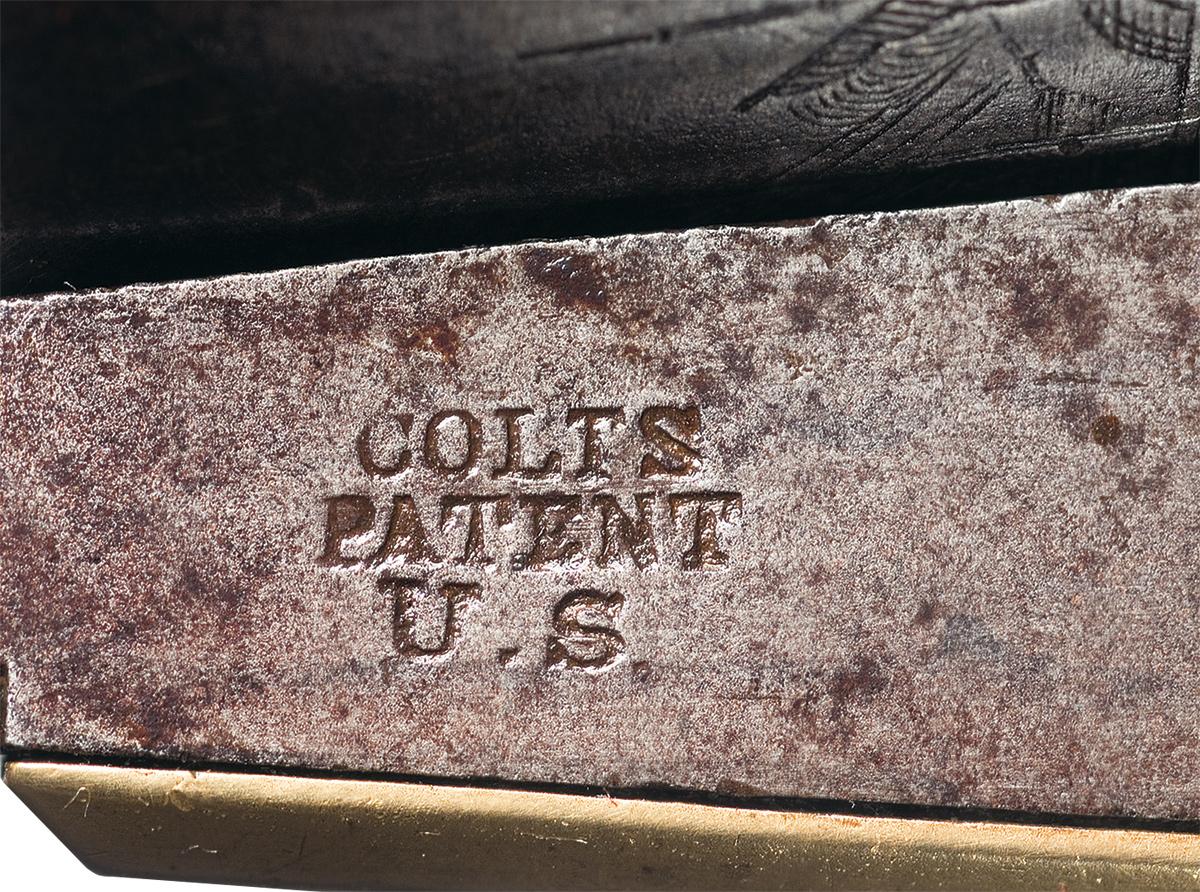 Condition: Very good plus. The metal surfaces have a crisp, even smooth dark mottled patina with traces of blue in the barrel lug area. There are a few minor dents on the cylinder and the scene is mostly visible. The brass has an aged "mustard color" patina and there are a few minor dings on the butt. The grip is very fine with several minor dings on the bottom, a few minor dents and fits the straps extremely well. The markings are clear. The action is excellent. This is a well above average, original, example of the most sought after U.S. Colt Percussion Revolver variation!