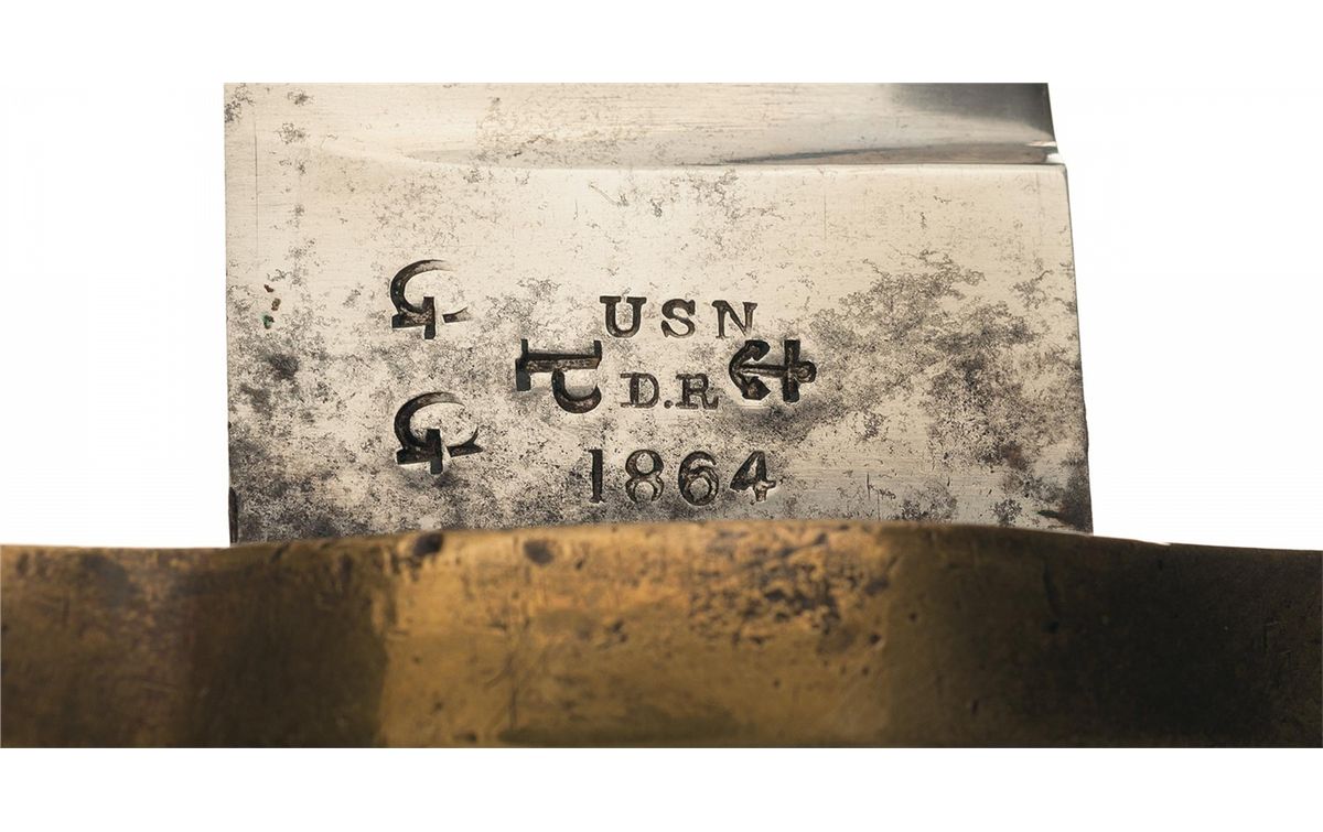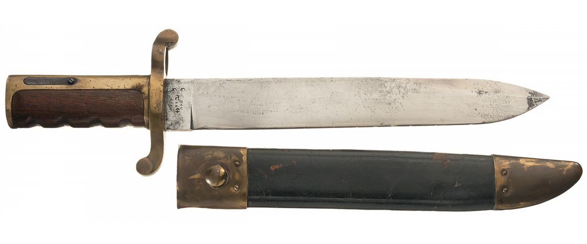 Designed by Admiral John Dahlgren as a replacement for the sword pattern bayonets then used on the 1861 Plymouth Rifle, the Dahlgren Bowie was made with an eye for the kind of brutal, up-close combat that unfolds during boarding actions, shore landings, and similar events. As such, Admiral Dahlgren's bowie was a combat knife first, and a bayonet second. 16 3/4 inches overall, with a 12 inch asymmetrical clip point blade, marked "USN/D.R/1864" and "(anchor)/P/G G" on the right ricasso and bearing the Ames address on the left. Brass and wood grip, with a "DR" cartouche on the pommel. Leather scabbard, with a brass throat and tip.
