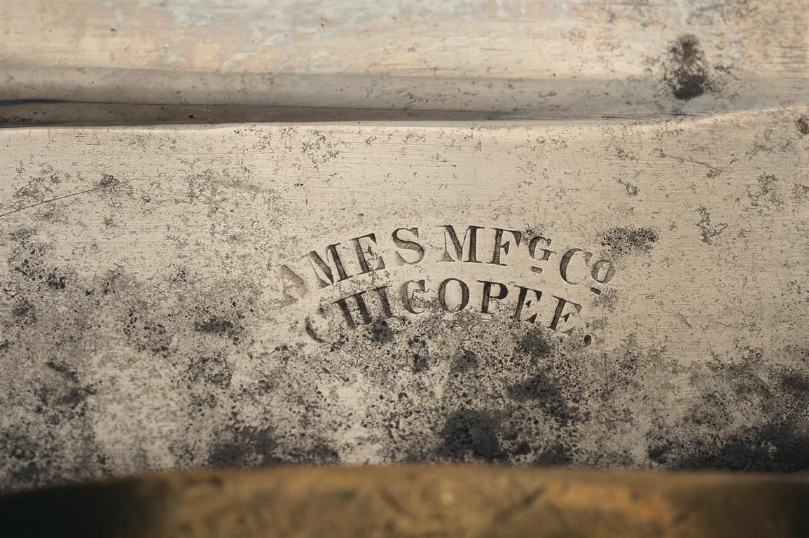 Fine, with spotting and dings on he blade, a mixed aged patina on the brass, and mild dents and scuffs on the grip. The Ames address has faded slightly, and some chips are present on the edge. Sheath is also fine, with some flaking of the leather and dents on the brass.