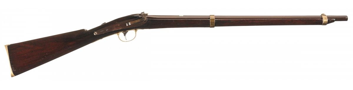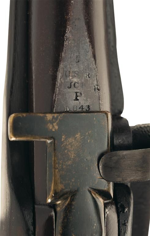 Manufactured in 1843, this is both a rare and highly sought after example of a Jenks Carbine with U.S. Revenue Cutter Service marking. The top of the barrel at the breech is marked "W. JENKS " ahead of "U.S.R./P/1843", with the proper round loading aperture beneath the brass breech arm. The lock plate is marked "Wm JENKS", with the hooked and checkered "mule ear" hammer. Smooth straight wrist stock, properly without saddle ring, with two "U" marked barrel bands, and a "US" marked brass buttplate.