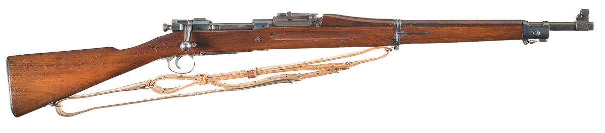 This is a fairly scarce variation of Sedgley rifle; in that it started as a 1903 RIA rifle with the original barrel that was only modified and fitted with a 1917 Enfield trigger guard and floor plate, and subsequently refinished by Sedgley. These rifles were primarily sold by Bannerman in the 20s and 30s. It has the original blade front and folding ladder rear sights, with "U.S." on the sight cover, Rock Island barrel dated "10-18", and faded markings on the receiver ring. Smooth straight grip stock, with grooved forearm, Model 1917 trigger guard, sling swivels, 1917 dated leather sling and a two bolt finger groove buttstock.