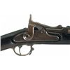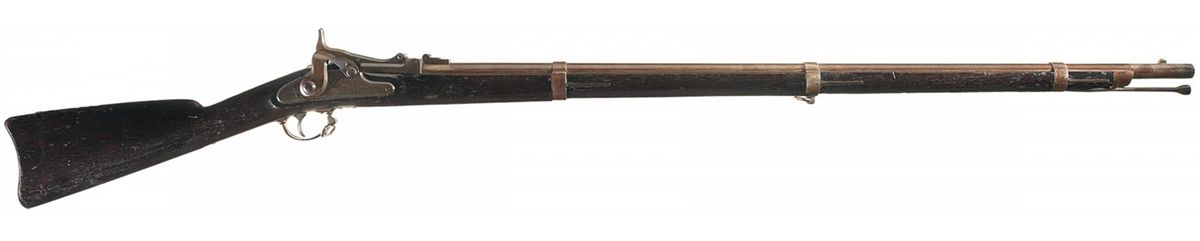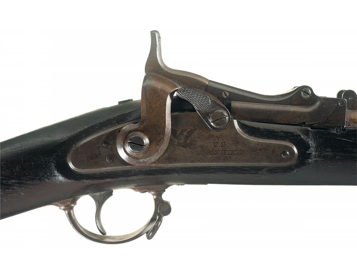 Developed by Erskine Allin, Springfield Master Armorer, the Allin Conversion was designed to take advantage of the sizeable quantity of Model 1863s that were stockpiled following the Civil War. The overall design and philosophy of the conversion (remove a section of the breech, mill a chamber into the barrel, install a hinged breechblock) remained consistent through all produced versions of Allin's system, but the First Model has some special features, such as the retention of a 58 caliber bore, a more sweeping profile to the top of the breechblock, and a spring loaded extractor/ejector assembly; opening the breech extends a cam-driven extractor, while retracting an ejector pin mounted in the bottom of the cutout, and when the breech is fully opened the extractor snaps back and the pin strikes the extracted cartridge, ejecting it from the weapon. Though an elegant and mechanically ingenious solution for rapidly clearing spent cartridges, the ejector/extractor was eliminated from later models in favor of less intricate extraction system. Blade front and proper 2-leaf rear sights, with the partial date "864" marked ahead of the tang and "P/eagle head" on the upper left flat of the barrel. The lock plate is marked "1865" behind the hammer, with the American eagle and "U.S./SPRINGFIELD" ahead, with the checkered breech lever resting in the bolster cutout. Smooth straight wrist stock, with three "U" marked barrel bands, tulip-head ramrod, "ESA" inspection cartouche on the left side flat, steel trigger guard and smooth "US" buttplate with "43/G/12/53" stamped on the heel, possibly a unit marking.