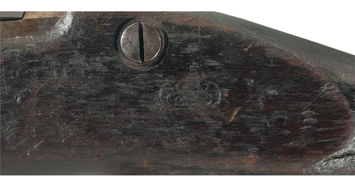 Fine, with 40% of the original blue finish on the breech, mixed with a light gray patina and areas of bright steel. Some scattered spotting and handling marks overall. The stock is fine, with mild chipping around the ramrod channel and upper edges of the forearm, a thin crack extending from the front lock plate screw, and mild scuffs and dents overall. Mechanically very good, with the lock and ejector mechanism in working order. A scarce and important example of America's transition from percussion arms to cartridge breechloaders, the link between the Rifle-Musket of the Civil War and the Trapdoor Rifle of the Westward Expansion. This example appears to be totally untouched, "attic finish"!