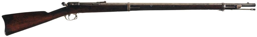 Springfield Armory manufactured only 1,011 Ward-Burton Rifles as basically trial weapons in 1871. The Ward-Burton Rifles were one of the earliest bolt action long arms issued by the U.S. Army. The left receiver flat is marked with the U.S. Eagle and Shield motif followed by "U.S./SPRINGFIELD 1871". The top of the bolt is marked "WARD BURTON PATENT/DEC. 20,1859-FEB 21, 1871". The receiver is casehardened, the bolt is bright and the remaining parts were finished in the white. The rifle is fitted with a Model 1868 trapdoor ramrod. The front sight is fixed and the rear sight is a folding leaf mounted just ahead of the receiver and is graduated to 900 yards (adjuster absent), and has a 1,000 yard center notch. Mounted with a full one-piece straight grip walnut stock with a steel end cap, two barrel bands and steel buttplate marked "U.S." on the tang. There is a sling swivel mounted on the forward barrel band and on the front of the trigger guard.