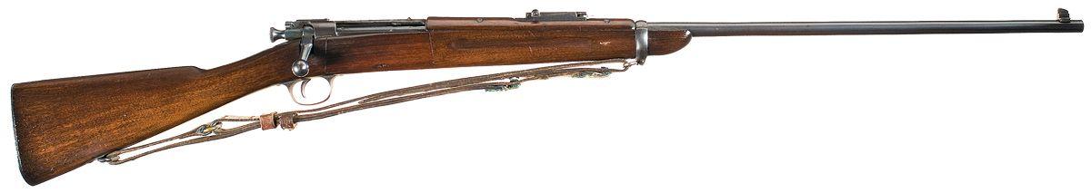 Standard markings and features with .30-40 Krag conversion to scarce .22 RF caliber. Right side of stock ahead of bolt where Krag magazine was located has been replaced. No visible markings on stock. Complete with military-style leather sling.
