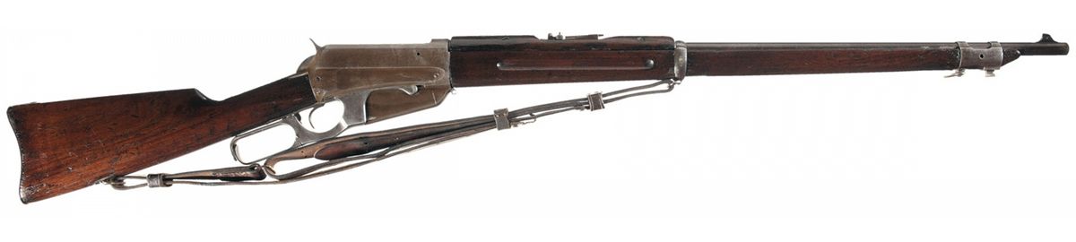 Manufactered in 1898. Blade front and folding ladder rear sights with the rear sight graduate to 1,800 yards. The left side of the receiver has the two line address/patent dates marking and the chamber is marked "U.S." Small three letter inspection marks appear on the bolt and hammer. The upper tang has the two line model marking. Two barrel bands with a bayonet lug on the front. Smooth straight grip stock with finger groove forearm, leather sling and crescent buttplate with trapdoor.