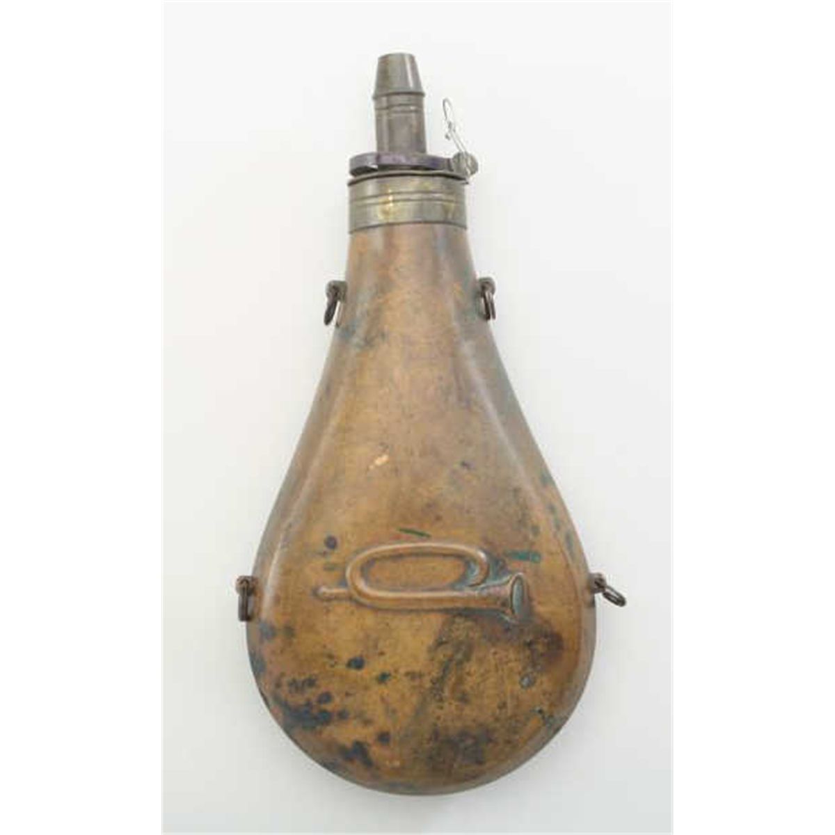 Scarce US “Public Property” marked powder flask in good condition showing tight seams, four original hanging rings, traces of lacquer, good patina, some minor dents and aging. Spring shows original blue, and isretained but coming loose. From the Keith Coulter collection. Est: $400 - $800