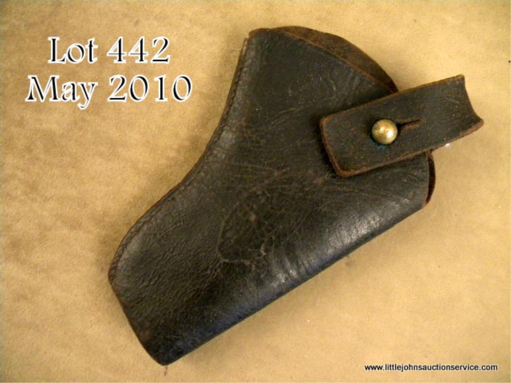 Scarce US military leather holster for a Remington Rolling Block Naval single shot pistol in overall good condition showing complete belt loop and flap strap; seam stitching intact, brass strap rivet button present, considerable traces oforiginal inspector’s cartouche on the front of the holster; some crazing to top layer of leather from aging. From the estate of C.W. Slagle. Est.: $100-$200.
