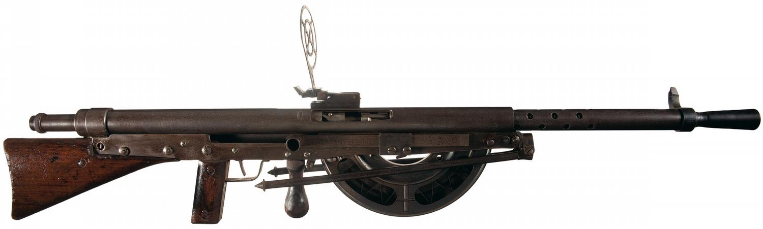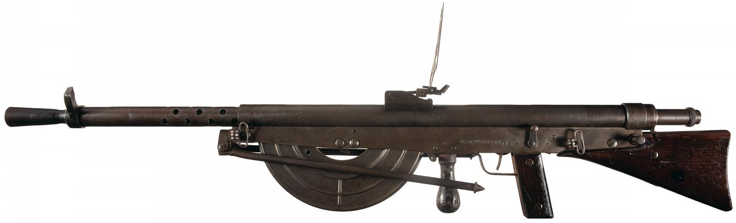 This is a solid example of an original WWI 1915 French "Chauchat" dewat machine gun. While called a machine gun by US terms, it is actually called an automatic rifle by the French. It was one of several type of squad level machine guns used by the French throughout WWI and was even purchased by the US Government as the model 1918 which fired the 30-06 round that employed a straight stick type magazine instead of the standard curved French model magazine. It has a very unique operating mechanism in that it has a rotating bolt or bolt head during the locking and unlocking mode similar to a Johnson rifle and can be fired in both the fully automatic and semi-automatic fashion like the Browning BAR. It operates in a direct blow back manner that uses a long-recoil type mechanism, mounted on top and to the rear of the receiver itself and is feed from a large curved type magazine fitted to the bottom of the weapon. Throughout the war it never proved itself as a very reliable machine gun as the side of the magazine, the opening for the operating rod and bolt area were all exposed to dirt and debris from the battlefields, causing it to jam often and making it not a favorite of the US forces. The left side of the receiver is marked "C.S.R.G. /134971 next to a small boxed "SA" proof indicating capture or use by the Finnish Army at some point. It has a walnut stock, pistol grip and forward support handle with a fixed front sight with a fully adjustable rear sight that has been fitted with a anti-aircraft aiming circle. NOTE: This is a fully transferable NFA Class III Firearm currently on a Form 5. You are required to check your state and/or local laws as to whether or not you may own this. This weapon can be transferred to a Class III dealer at no charge. Buyer pays all other transfer fees and stamps.