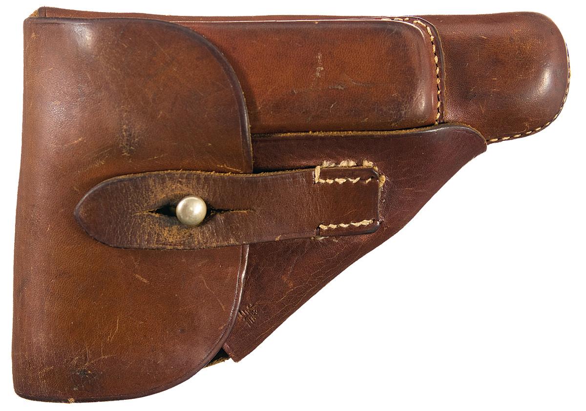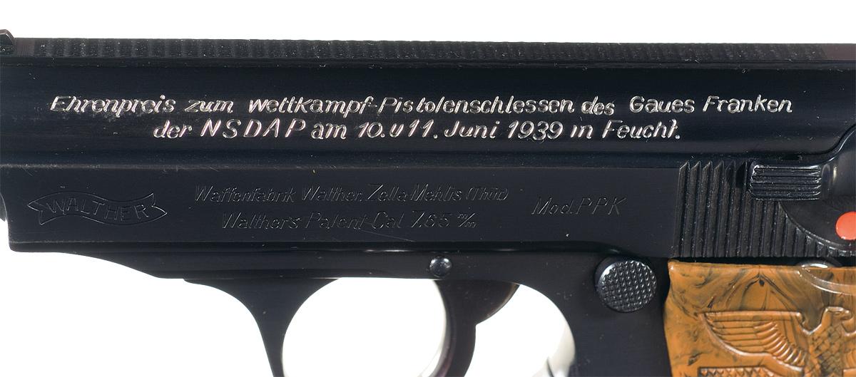 Known officially as the "Honor Weapon of the Political Leaders". The PPK pistols with these special grips were presented to NSDAP officials for meritorious party service by the Fuhrer. This particular pistol has the upper left side of the slide marked with the presentation inscription: "Ehrenpreis zum Wettkampf-Pistolenschlessen des Gaues Franken / der NSDAP am 10. u 11. Juni in Freucht.". The lower left side of the slide is marked with the standard Walther banner, address, caliber designation and "Mod. PPK". The right side of the barrel at the chamber and slide below the ejection port are marked with the pre-war commercial "crown / N" proofmark and the serial number is marked on the right side of the frame. The pistol is fitted with the one piece brown plastic wrap around grips that are checkered and have the NSDAP eagle holding a wreath encircled swastika insignia cast on the top of the both sides. The pistol has a side magazine release, lanyard loop at the bottom of the frame, 60 degree safety lever, and cartridge indicator pin. The magazine has a brown plastic finger extension and is marked with the Walther banner on the lower left side. Complete with a brown flap holster marked "SA" on the back and marked with an "eagle / C" on the lower flap.