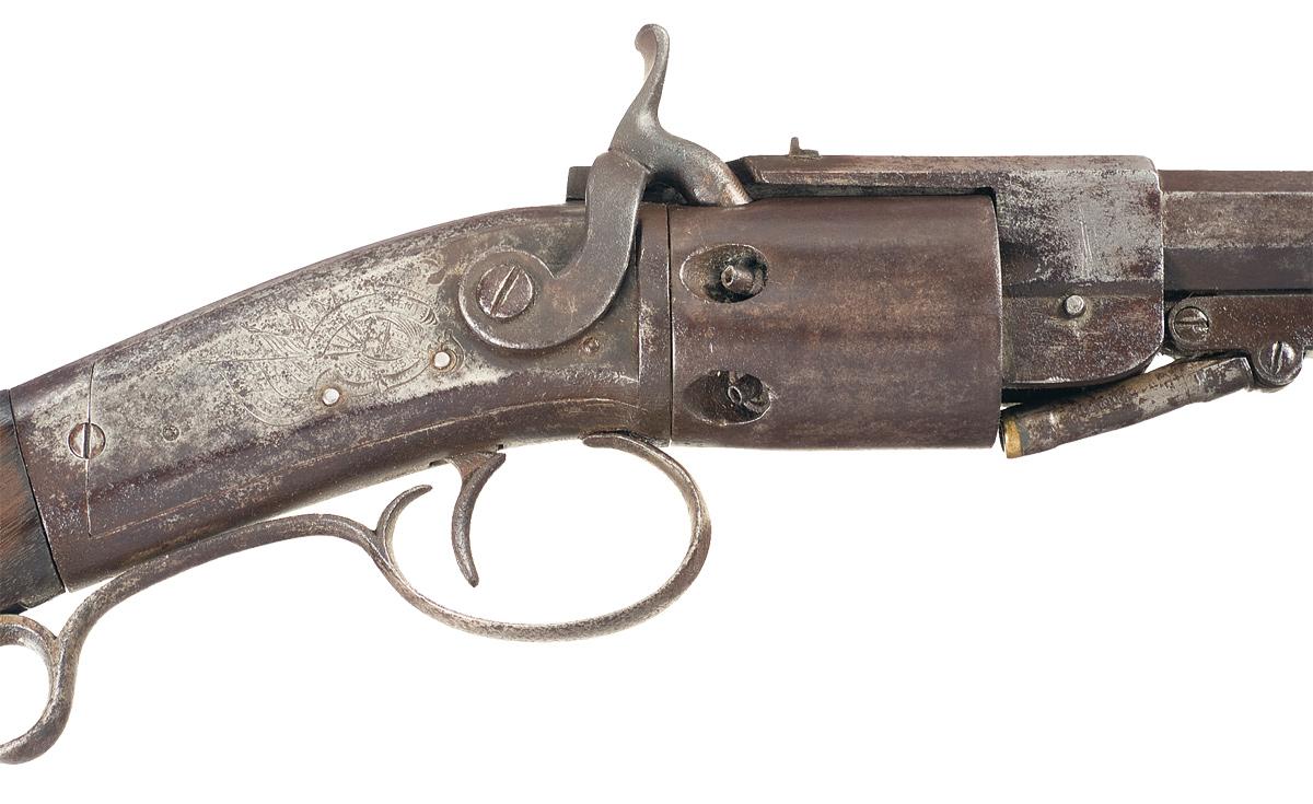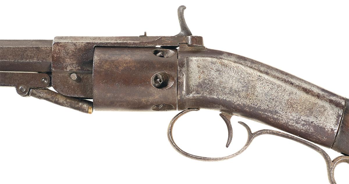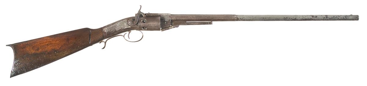 Manufactured by the Springfield Arms Company. Silver blade front and notch rear sights, with a brass tipped Warner type loading lever. Iron frame, with engraved flag and shield designs on both sides and "WARNER'S PATENT / JAN. 1851" in a banner on the right. Smooth straight grip stock, with a filed groove on the right hand side of the wrist, a wire inserted into the groove, proper style shadow line cheekpiece and a steel carbine buttplate. Although serial numbers on existing specimens indicate that almost 250 were made, very few are known.